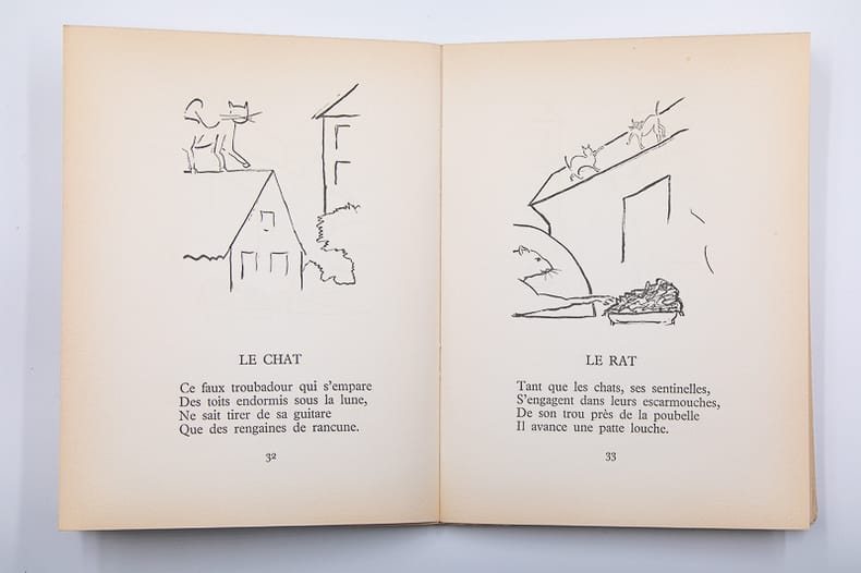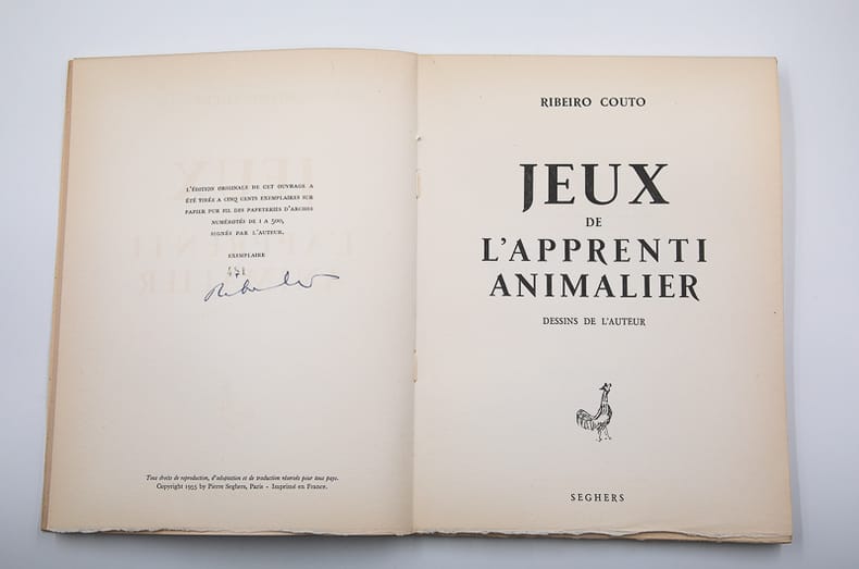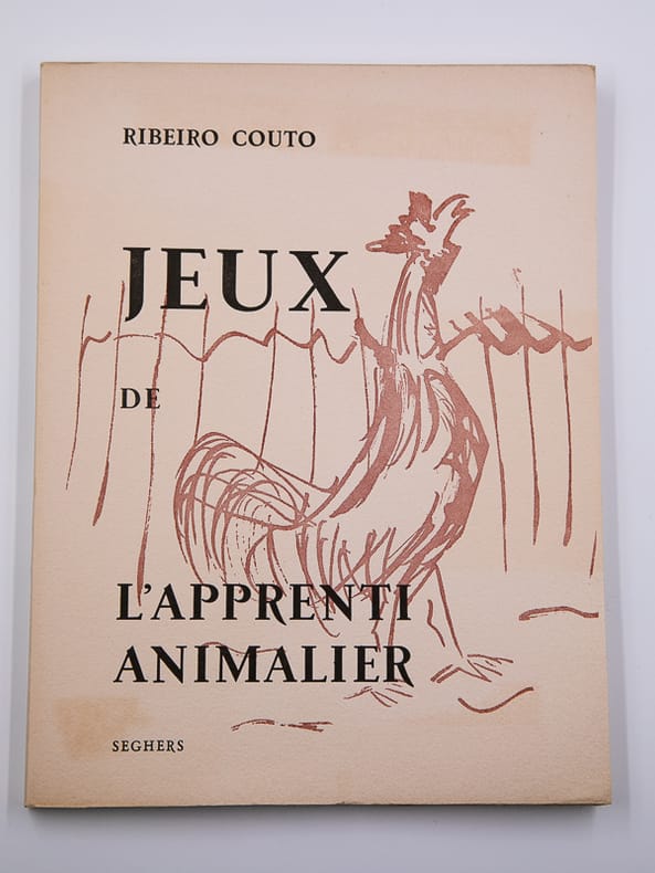 Paris, Seghers, 1955. Édition originale numérotée à 500 exemplaires, celui-ci portant le numéro 264. Envoi autographe de l'auteur en page de faux-titre depuis Paris en 1956, plus signature manuscrite sous la numérotation. Un livre broché. Grand in-8 de 252 x 193 mm pour 81 (6) pp. Sur pur fil des papeteries d'Arches. Brefs poèmes illustrés de dessins de l'auteur. Discret tampon noir en bas au coin de la garde volante, de la page de faux-titre et du dernier feuillet de l'ouvrage. Quelques poèmes surlignés en marge, probablement de la main de Ribeiro Couto. Marque au stylo bille sur le dernier feuillet indiquant que l'ouvrage a été offert en cadeau en 2001.
