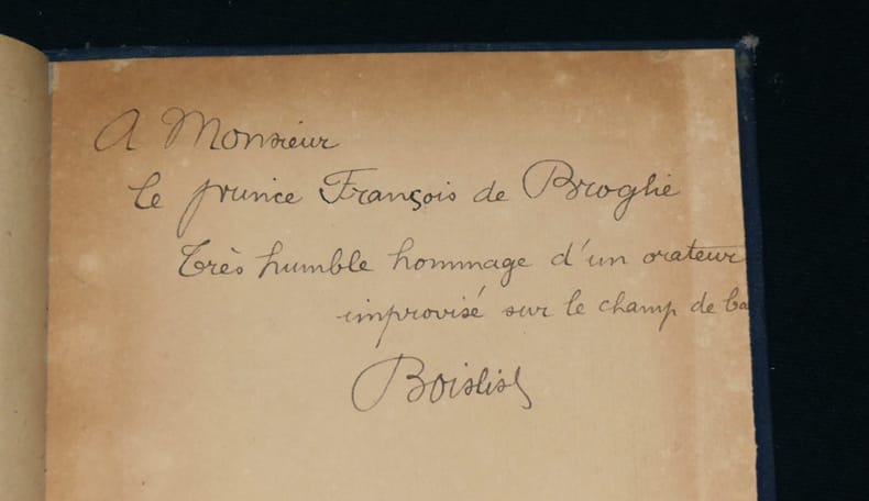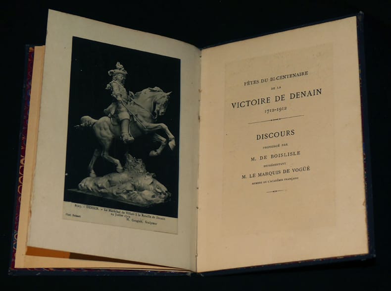 Relié "Plaquette au format de 13.5 * 18.8 cm, reliée pleine toile bleue, pièce de titre, 15 pages imprimées sur beau papier, Envoi de l'auteur : ""A monsieur le prince François de Broglie, très humble hommage d'un orateur improvisé sur la champ de ba (mot coupé par le relieur) Boislisle"" ex-libris De Broglie Dampmartin au contre plat, un frontispice contre-collé : portrait à cheval (Sculpture) du maréchal de Villars à la bataille de Denain le 24 juillet 1712, Sculpture de H. Gauguié ; coiffes frottées, charnière de garde coupée mais la reliure se tient encore très bien, bon état. Livraison a domicile (La Poste) ou en Mondial Relay sur simple demande."