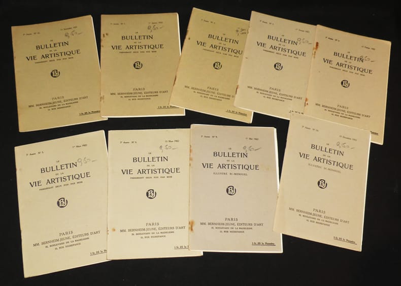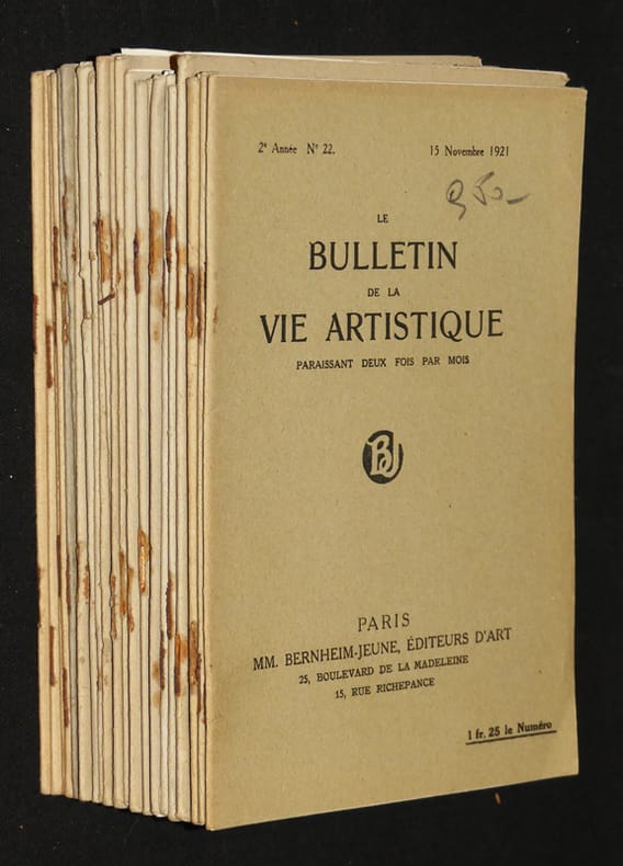 Paris, MM. Bernheim-jeune, éditeur d'art, 25, Boulevard de la madeleine, 15 rue Richepance Agrafé 1921 Ensemble de 26 numéro au format (13,7 * 20 cm), environ 24 pages par bulletin, comprenant les numéros suivant : n° 22 du 15 novembre 1921, n° 1 du 1° janvier 1922, n° 2 du 15 janvier 1922, n° 3 du 1 février 1922, n° 4 du 15 février 1922, n° 5 du 1° mars 1922, n° 6 du 15 mars 1922, n° 9 du 1° mai 1922, n° 24 du 15 décembre 1922, n° 2 du 15 janvier 1923, n° 13 du 1° juillet 1923, le n° 14 du 15 juillet 1923, le n° 15 du 1° août 1923, le n° 16 du 15 août 1923, le n° 17 du 15 septembre 1923, le n° 19 du 1° octobre 1923, le n° 20 du 15 octobre 1923, le n° 23 du 1 décembre 1923, le n° 24 du 15 décembre 1923, le n° 4 du 15 février 1924, le n° 14 du 15 juillet 1924, le n° 20 du 15 octobre 1924, le n° 21 du 1° novembre 1924, le n° 22 du 15 novembre 1924, le n° 23 du 1° décembre 1924 et pour finir le n° 24 du 15 décembre 1924 ; agrafes rouillées, parfois manquante, intérieures frais, bon état. Livraison a domicile (La Poste) ou en Mondial Relay sur simple demande.