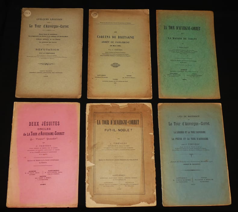 Rennes, Plihon & Hommay, Vannes, Imprimerie Galles, place de l'Hôtel-de-ville, Saint-Brieuc, imprimerie-librairie-lithographie René Prud'Homme, Quimper, M. Le Bras, libraire, rue Kéréon, Saint-Brieux, Imprimerie Francisque Guyon, libraire-éditeur, rue de la préfecture, 18 Broché Rare lot 5 plaquettes de Tréverdy sur la Tour d'Auvergne-Corret et une sur les Caquins de Bretagne, soit 6 plaquettes au total : La Tour d'Auvergne-Corret et la maison de Coigny, extrait du bulletin de la société d'archéologie du Finistère, Quimper 1907, 22 pages, bords jaunis, bon état. Quelques légendes relatives à la Tour d'Auvergne : deux lieux de naissance : la seigneurie de Correc et le chateau de Kerbauffret - L'école militaire de la Flèche - La noblesse des Corret. Réfutation. 59 pages. Saint-Brieuc, 1902. Bon état. Deux jésuites oncles de la Tour d'Auvergne. Le premier grenadier. 35 pages. 1902. Couverture détachée et coupée en deux au niveau du dos mais présente. La Tour d'Auvergne-Corret fut-il noble ? 55 pages, 4° de couverture manquante, première de couverture très abimée, intérieur frais. 1904. Lieu de naissance de la tour d'Auvergne-Corret - la légende et la tour d'Auvergne - la poésie et la tour d'Auvergne. 1900. 32 pages. 4° de couverture abimée. On joint Les caquins de Bretagne arrêt du parlement (20 mars 1681) du même, 64 pages ; assez bon état général malgré les défauts sus-mentionnés. Livraison a domicile (La Poste) ou en Mondial Relay sur simple demande.