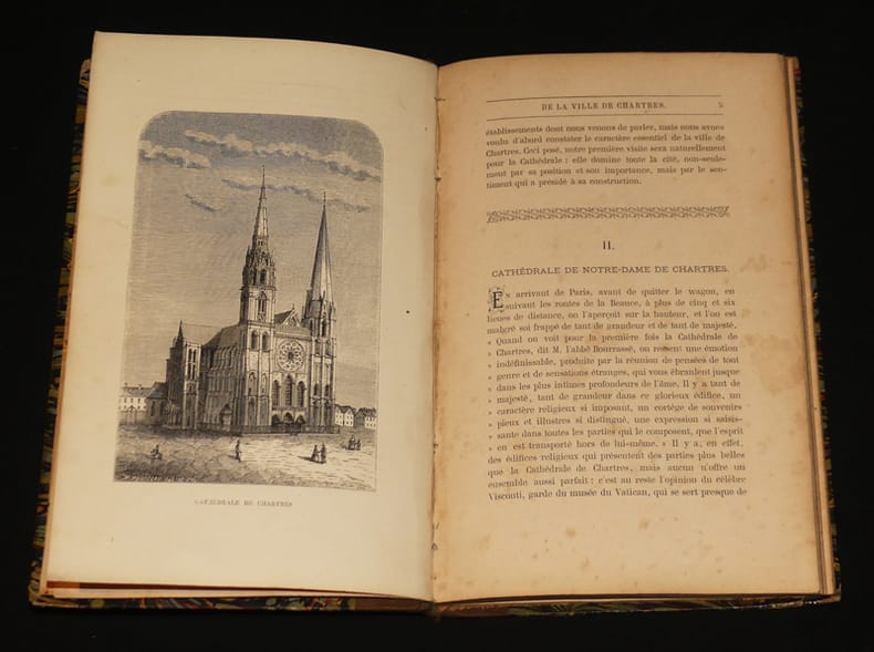 Chartres, Georges Durand, Imprimeur - Éditeur, 8, rue Serpente, 8 Relié 1869 TRÈS RARE GUIDE DE CHARTRES, xix chapitres sur 55 pages et 16 pages de publicité, gravures décrivant des bâtiments, des détails d'architecture, ouvrage publié à l'occasion de l'exposition départementale de 1869. Publié sous les auspices du comité. Volume relié au format in-8°, (14 * 22 cm), 55 pages et 16 pages de publicités, 4 planches hors-texte ; papier bruni avec quelques rousseurs, bon état. Livraison a domicile (La Poste) ou en Mondial Relay sur simple demande.