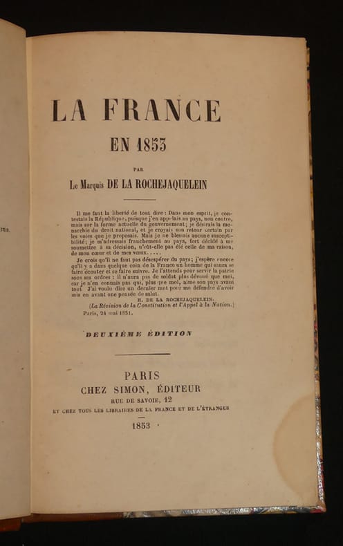 2. Paris, chez Simon, éditeur, 1853, 266 pp, reliure en demi-cuir rouge d'époque, dos à 4 nerfs avec titre doré, intérieur avec des rousseurs et traces d'humidité.