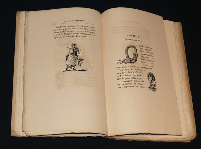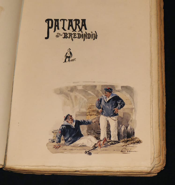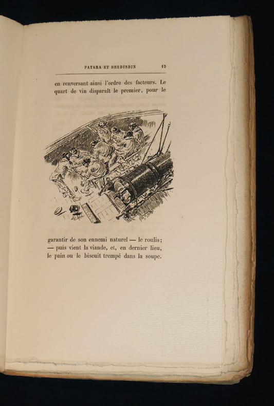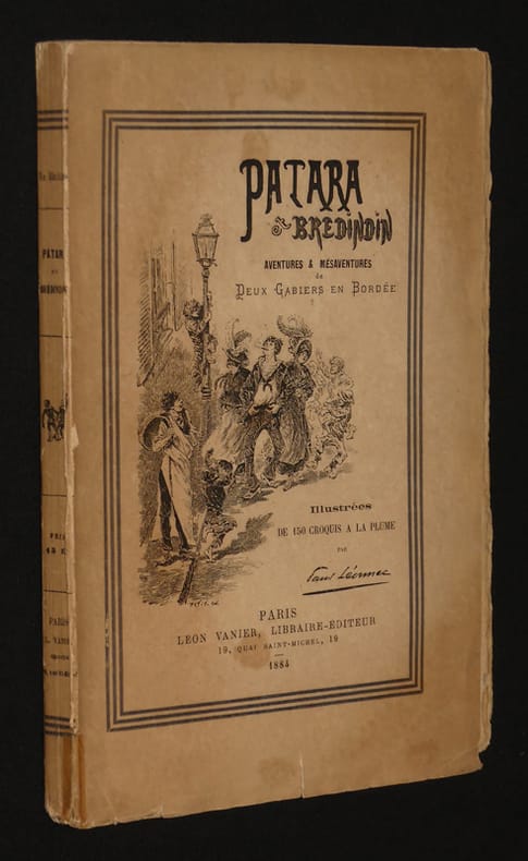 Édition ornée par Paul Léonnec de 150 compositions dans le texte, d'après des croquis à la plume très expressifs. Cette « farce maritime », bien imprimée par Lahure, évoque la vie de deux marins à terre en pleine bamboche. Edition originale de la préface de l'éditeur Léon Vanier. L'originale du récit, parue en 1843, portait le titre Physiologie du Matelot. Aventures de Patara et Bredindin, par E. P., ex-fourrier du Suffren (Vicaire VI, 626). Le Breton Paul Léonnec (1842 - 1899) était officier de marine et caricaturiste au Journal Amusant. Un des quelques exemplaires sur Japon, justifié (n° 9) et paraphé par l'éditeur. Il est enrichi d'une très jolie aquarelle originale signée Félix Oudart, couvrant tout le faux-titre. Vicaire V, 211, n'indique pas de tirage en grand papier.