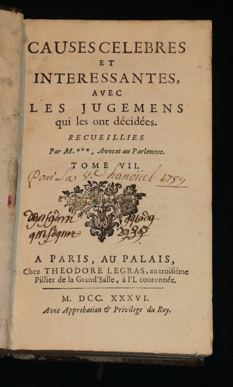 Contient : Mariage déclaré abusif - Concubine donataire - Pipeurs confondus - Soufflet donné à une jolie femme - Querelle entre un seigneur (comte de Nogent) et un particulier (François Brochard) - Femme adultère - La Fausse testatrice - Enfant réclamé par deux mères - Legs fait sous une condition contre les bonnes moeurs -