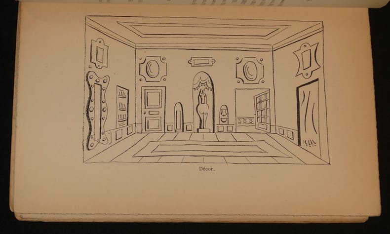Paris, Stock, 1927 12 X 19 cm., broché, 131 pages. Édition originale. Tirage limité à 686 exemplaires numérotés, le nôtre un des 525 sur papier pur fil des marais. Le texte de la pièce est précédé du dessin et du plan du décor, et suivi de notes de mise en scène. Traces sur la couverture, dos insolé, mors supérieur fendu sur 2 cm en queue. Absence de rousseurs.
