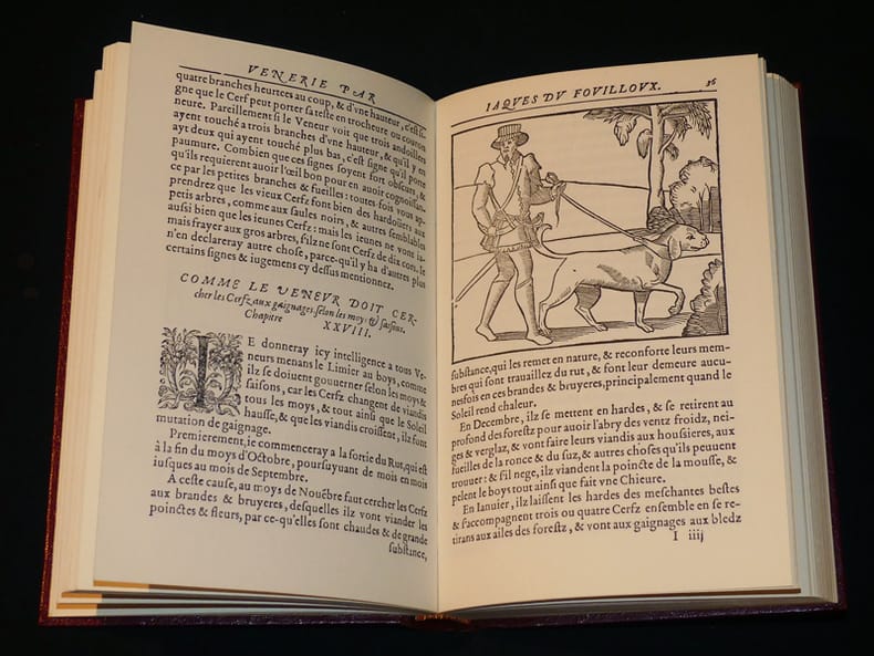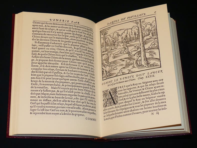 Paris, Emile Nourry, Editeur, Librairie Cynégétique, M DCCCC XXVIII, (1928), in-4to, LV + 266 p. + 1 feuille de table / colophon + 3 ff. blanches, richement illustrées de reproductions de bois ancien d’après l'éd. original de 1585, un des 1500 ex. sur Alfa satiné num. de 51 à 1550, N° 759, reliure à plein veau blond, dos à cinq nerfs, pièces de titre, de date et d’auteur sur cuir rouge et bleu foncé, tête dorée, brochure orig. (cons.). Bel exemplaire.