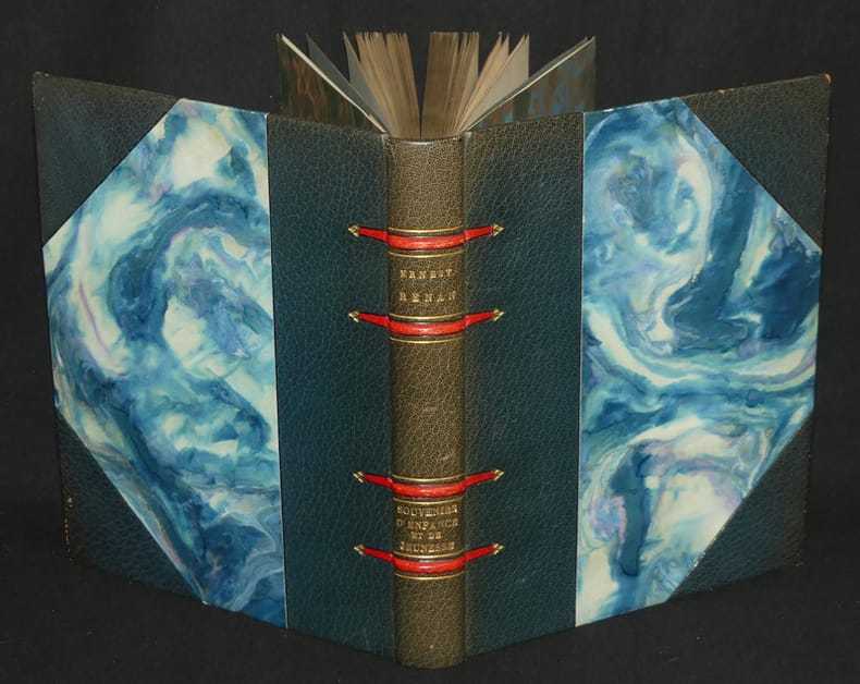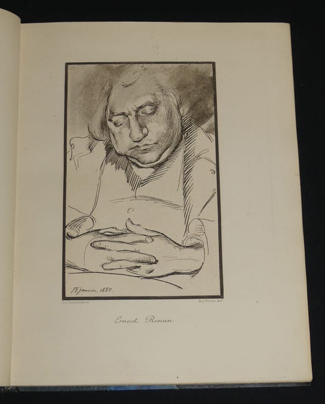 La Connaissance Relié 1922 In-8 (20,2 x 25 cm), reliure demi maroquin à coins, dos à 4 nerfs rouges, tête dorée, gardes couleur, couverture et dos conservés, 293 pages, 1 de 980 exemplaires numérotés sur pur fil Lafuma (n°351), joli portrait d'Ernest Renan gravé en frontispice, gravures en noir hors texte de G. Zévort, têtes de chapitre et lettrines ; dos bruni, petits frottements aux coins et angles des coiffes, par ailleurs bel exemplaire. Livraison a domicile (La Poste) ou en Mondial Relay sur simple demande.