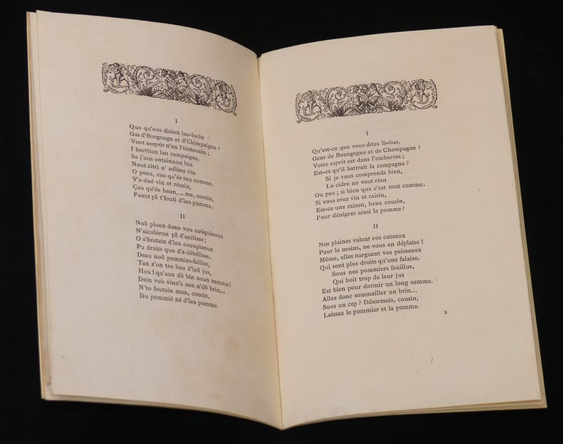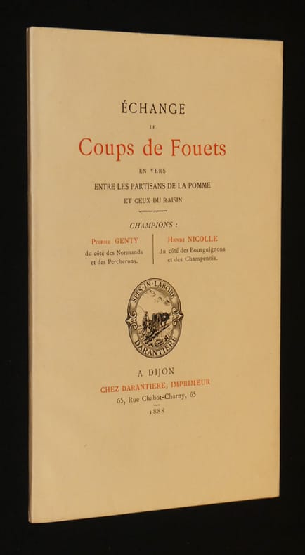 A Dijon, chez Darantière, imprimeur Plaquette 1888 In-8 (12,7 x 20,5 cm), broché, couverture rempliée, 21 pages, passe d'armes en vers entre les partisans du cidre et ceux du vin en 1885 ; quelques rousseurs sur les premiers feuillets et au quatrième plat le long du mors inférieur, par ailleurs très bel exemplaire. Livraison a domicile (La Poste) ou en Mondial Relay sur simple demande.