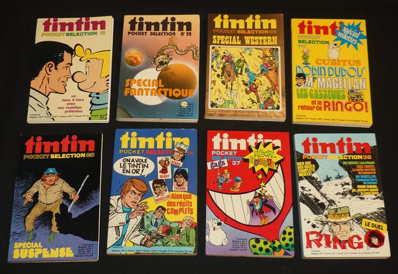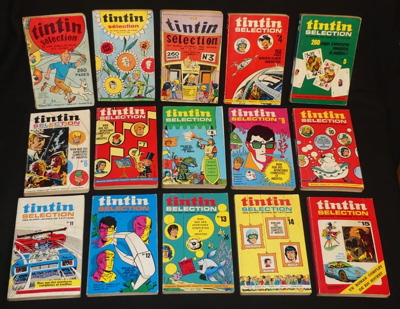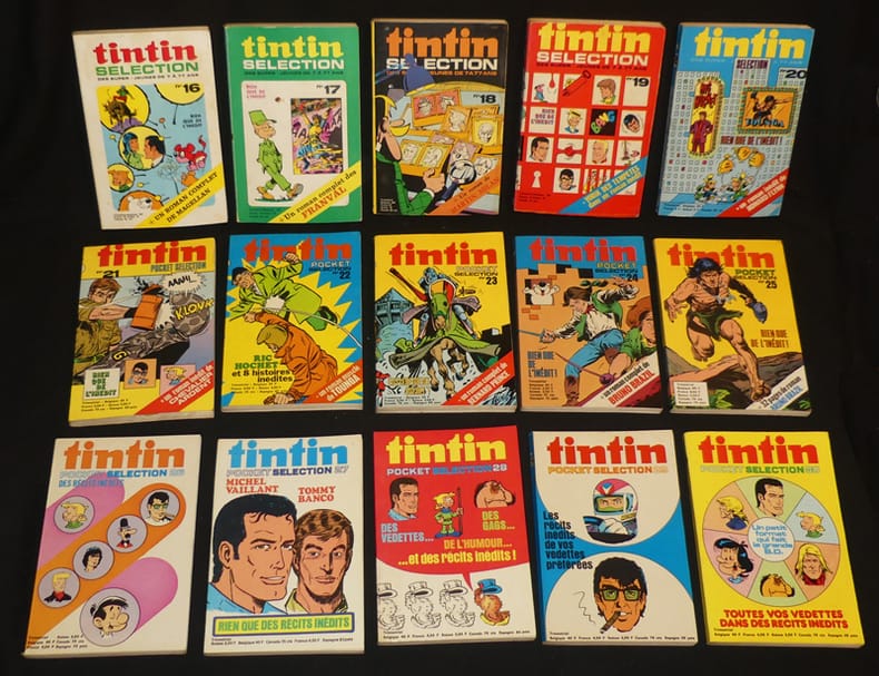Dargaud, Editions du Lombard Revue 1968 "In-8 (12,3 x 19 cm), dos carré collé, n°1 à 38 de ""Tintin Sélection"", supplément hors-série du Journal Tintin, le premier numéro est indiqué ""numéro spécial hors série"" et non n°1 ; pliures au dos d'environ la moitié des volumes, traces, pliures et/ou frottements aux plats, plus ou moins prononcés selon le volume, le n°1 est abîmé (frottements et manques au dos, reliure très fragile, pages 227 à 250 désolidarisées), par ailleurs assez bon état général. Livraison a domicile (La Poste) ou en Mondial Relay sur simple demande."