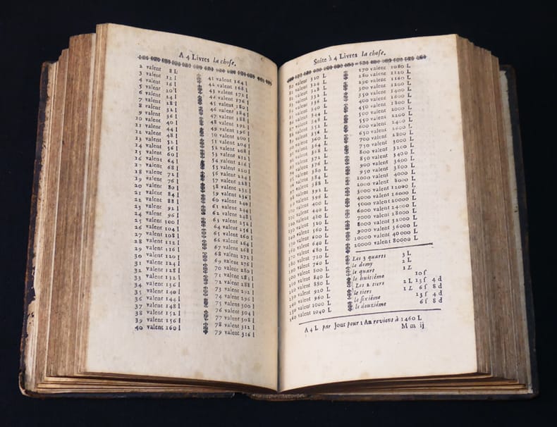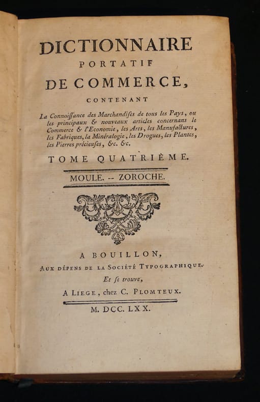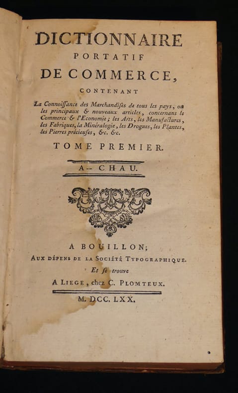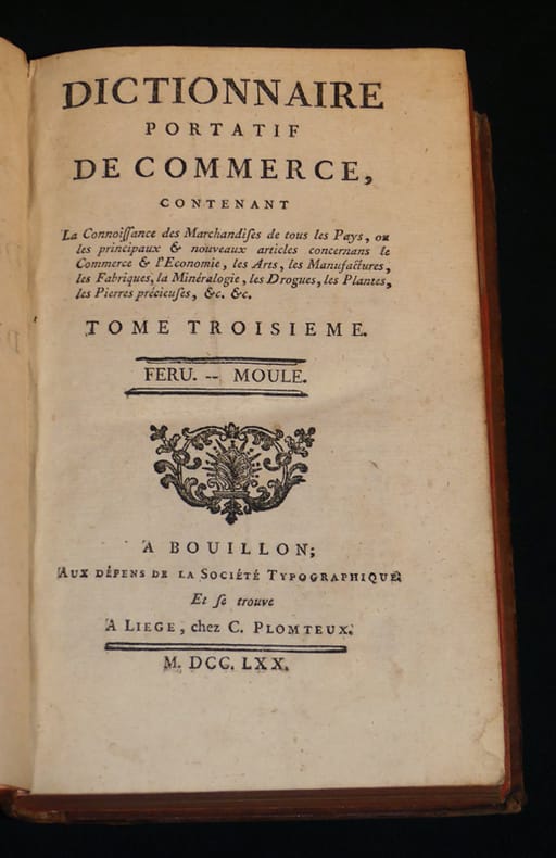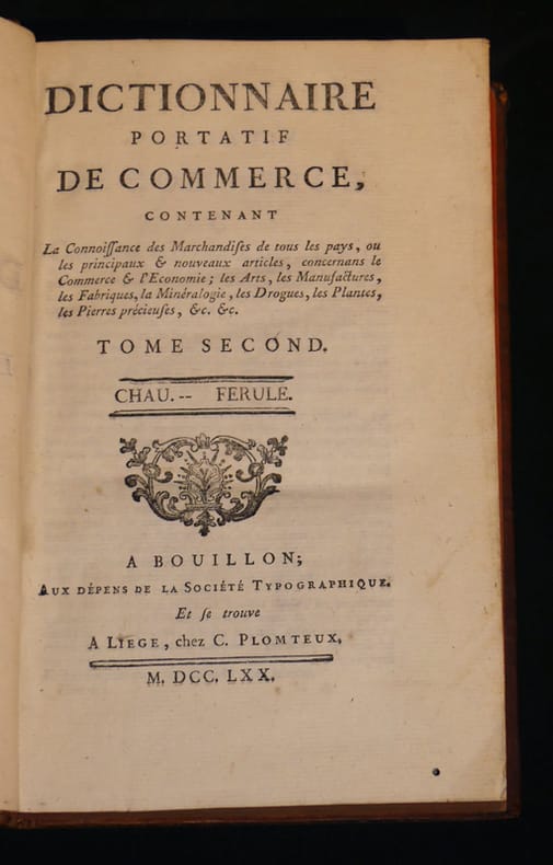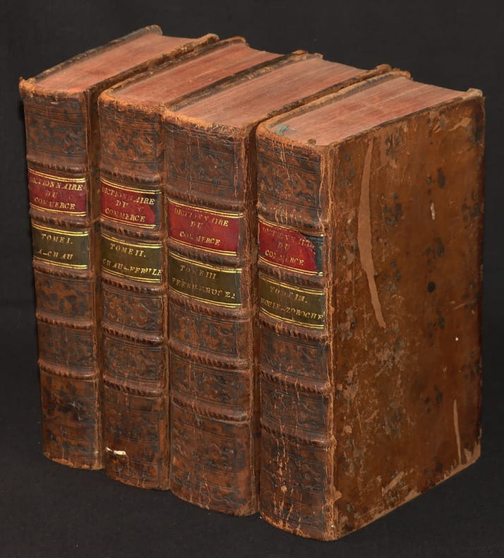 A Bouillon, aux dépens de la Société Typographique, A Liège, chez C. Plomteux Relié 1770 "Quatre volumes in-8 (13 x 20,5 cm), reliure plein veau, dos à 5 nerfs ornés de pièces de titre et de tomaison, tranches rouges, 572, 596, 780 et 720 pages, titre complet : ""Dictionnaire portatif du commerce, contenant la connoissance des marchandises de tous les pays, ou les principaux et nouveaux articles concernans le commerce et l'économie, les arts, les manufactures, les fabriques, la minéralogie, les drogues, les plantes, les pierres précieuses, etc."" ; frottements et épidermures aux plats, dos légèrement craquelés, petits trous de vers au dos du tome 2 en queue, mouillure au faux titre et au titre du tome 1, ex-libris manuscrits aux gardes, par ailleurs assez bon état général. Livraison a domicile (La Poste) ou en Mondial Relay sur simple demande."