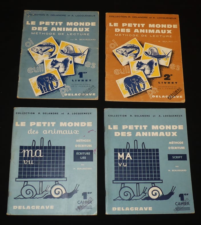 Delagrave R. Delandre et A. Locqueneux Fascicules 1961 "In-8 (17,8 x 22,3 cm), dos agrafé, lot de 4 fascicules ""Le petit monde des animaux"" : 2 livrets de méthode de lecture illustrés par L. Parrens, et deux méthodes d'écriture (script et liée) ; dos blanchis, frottements et traces aux plats, le cahier d'écriture liée a été en partie utilisé, tampons ""spécimen"" aux premiers plats, petite déchirure sans manque au premier plat et aux premiers feuillets du 1er livret de la méthode de lecture, par ailleurs assez bon état général. Livraison a domicile (La Poste) ou en Mondial Relay sur simple demande."
