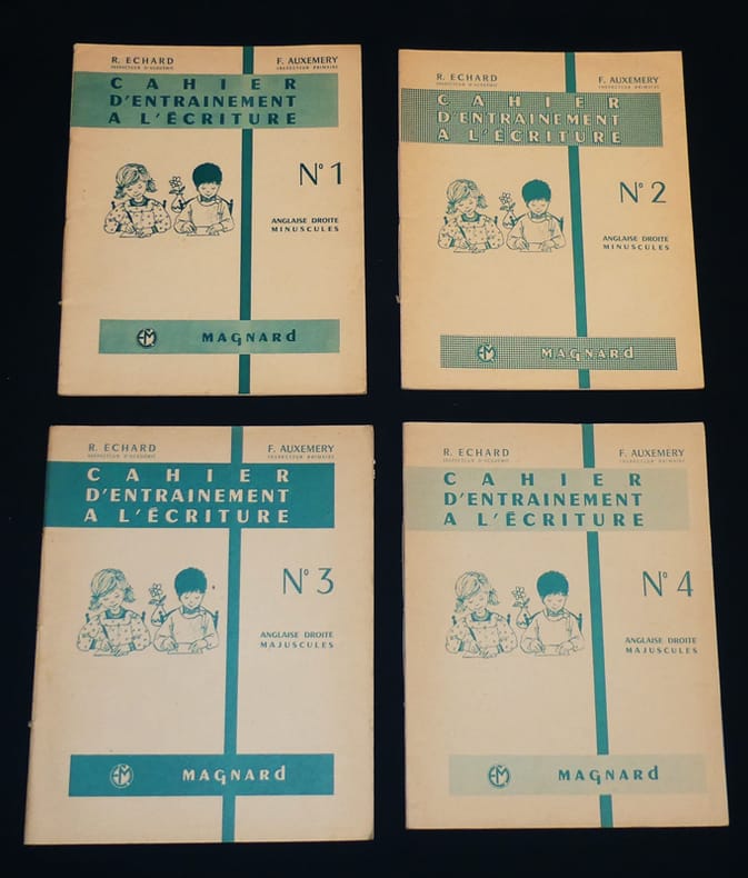 Magnard Fascicules 1963 Quatre fascicules in-8 brochés, cahiers d'entraînement à l'écriture, n°1 et 2 : Anglaise droite minuscules // n°3 et 4 : Anglaise droite majuscules ; cahiers vierges, bel état général. Livraison a domicile (La Poste) ou en Mondial Relay sur simple demande.