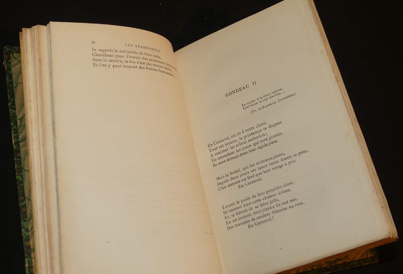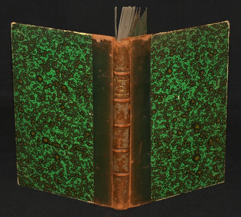 Première édition. Exemplaire complet de ses deux parties. Ce charmant ouvrage est illustré de 78 planches gravées par Gaitte sur les dessins de l'auteur. Ces "arabesques" sont des emblèmes des divinités de l'Antiquité. Elles ont été imprimées en couleurs. On trouve plus souvent des exemplaires en noir et blanc. (A noter que le titre est alors différent. Le titre du premier volume des exemplaires en couleurs portent "en 54 gravées en couleurs d'après les dessins coloriés de Madame de Genlis", ceux en noir, "en 54 gravées d'après les dessins coloriés..."). Madame de Genlis (1746 - 1830) a été la gouvernante du futur roi Louis-Philippe et a publié de nombreux ouvrages pour la jeunesse. Très bel exemplaire, luxueusement relié par François Bozérian, dit le jeune, l'un des relieurs les plus fameux du XIXe siècle, qui exerça de 1801 à 1818. /// 2 volumes in-8 de (4), XXX, 166 (notée 266) pp., 54 planches / (4), IV, 228, (2) pp., 24 planches. Maroquin à longs grains rouge, dos très orné, encadrements dorés sur les plats, tranches dorées. (Reliure de l'époque.) //// First edition. This charming emblem book on gods of Antiquity is illustrated by 78 engraved colour-printed plates by Gaitte after designs by the author. Madame de Genlis (1746 - 1830), after having been governess to the future king Louis-Philippe, is the author of many educational works. This book is more often found with plates in black and white. Very fine copy bound by François Bozérian, one of the most famous binder of the 19th c.