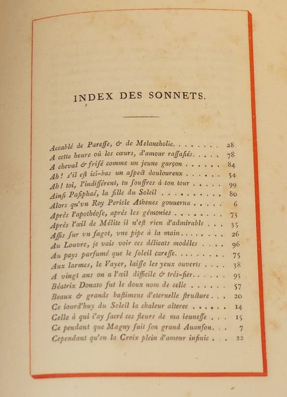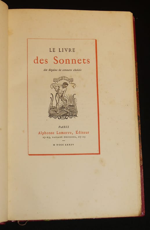 Choix effectué parmi les meilleurs sonnets de la poésie française du XVIe au XIXe siècle, Ronsard, Du Bellay, de Baif, Malherbe, Leconte de Lisle, Hérédia, Nerval, Baudelaire, etc..On a joint un sonnet manuscrit (14 vers) , pastiche du célèbre sonnet d'Arvers sur Marie Menessier - Nodier (cf. Sonnet imité de l' italien , p. 59). Ce manuscrit autographe d' 1 page in-8° à l'encre noire " Sur une pauvre petite machine à écrire" , du 20-12-19, est donné à Romain Laveille, par une main anonyme,au crayon, au bas de la feuille. Sur une autre feuille , in-12°, imprimée à l'entête de Hippolyte Savary, Vice-Président de la Haute-Cour, le sonnet est donné à ce dernier à la date du 30 juin 1898. (CO1)
