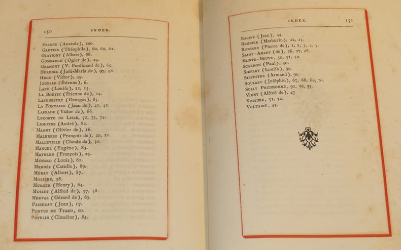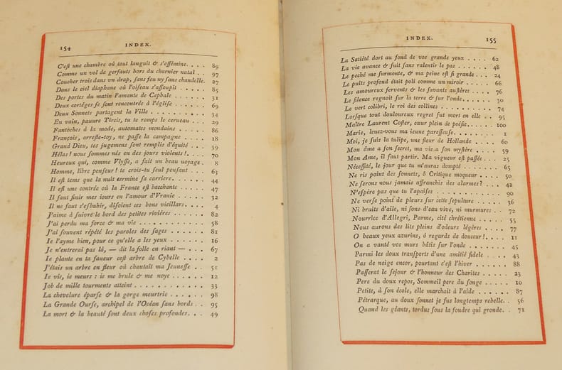 Paris, Lemerre,en 1874. Dix dizains de sonnets choisis. In-8 en plein maroquin signé Cuzin. Ex.n°48 sur papier Whatman signé au crayon bleu par l'éditeur.156 pages. Avec Notes et Variantes, Appendice (Les règles du Sonnet), Index des Auteurs, Index des Sonnets, Errata.Belle reliure janséniste. Tranches dorées. Bel exemplaire.Quelques rousseurs sur les pages de garde.