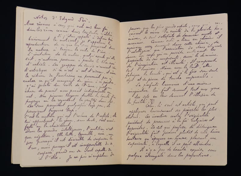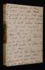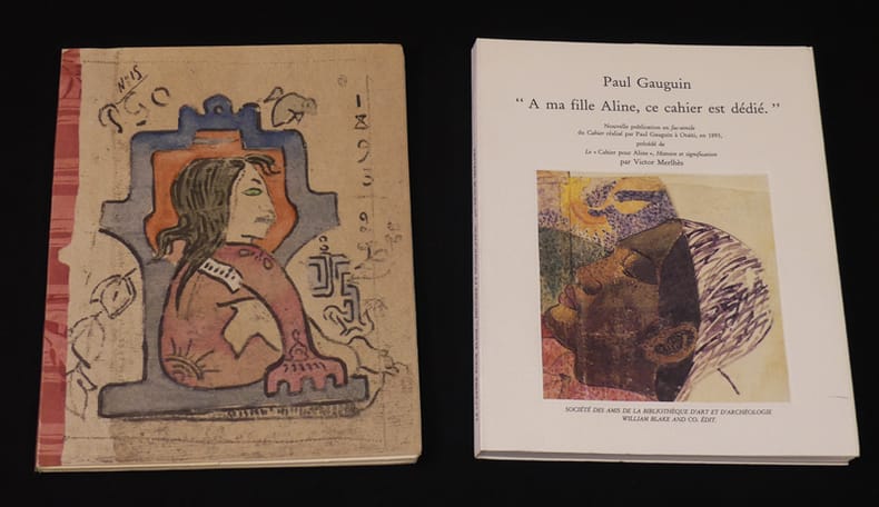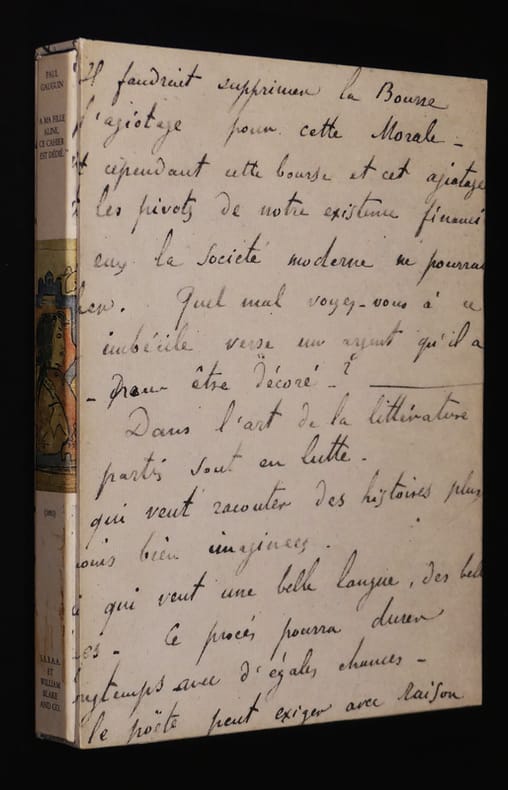 Publication nouvelle, en fac-simile, du Cahier réalisé par Paul Gauguin à Otaïti, en 1983, précédé d'un volume de commentaires et documents réunis par Victor Merlhès intitulé Le Cahier pour Aline, Histoire et significationWilliam Blake and Co. Edit., Bordeaux / Société des Amis de la Bibliothèque d'Art et d'Archéologie, Paris, 1989.Photocomposé en Garamond corps 11 ; tirage limité à 1000 exemplaires dont 300 exemplaires de tête sur vélin d'Arches 160 g numérotés 1 à 300 sur vergé Van Gelder numérotés 301 à 1000 ; broché sous couverture rempliée vélin d'Arches 250 g ornée d'une vignette en quadrichromie présentés sous coffret éditeur imprimé d'une page manuscrite en fac-simile de Paul Gauguin ; broché. 17 x 22 cm. 92 p., ill. en noir, 62 p., 17 x 22 cm.Fac-simile réalisé en phototypie rehaussée au pochoir, à la main, sur papier teinté dans la masse par l'atelier Jacomet.