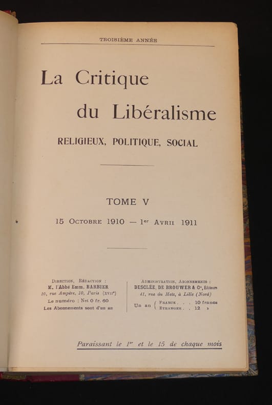 Desclée de Brouwer Revue relié 1910 In-8 (16,5 x 23,5 cm), reliure demi-chagrin, dos à 4 nerfs, Tome 5 contenant la 3e année de cette rare revue couvrant la période du 15 octobre 1910 au 1er avril 1911 ; épidermures sur le cuir, coupes frottées, par ailleurs assez bon état général. Livraison a domicile (La Poste) ou en Mondial Relay sur simple demande.