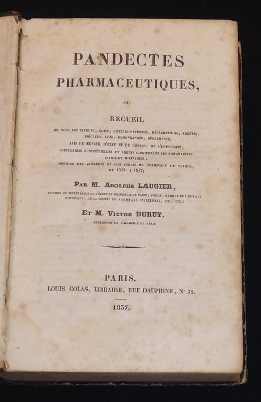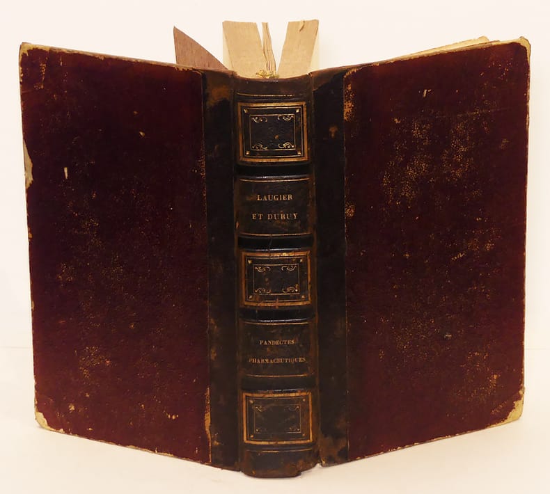 Louis Colas, libraire Relié 1837 "Titre complet : ""Pandectes pharmaceutiques, ou recueil de tous les statuts, édits, lettres-patentes, déclarations, arrêtés, décrets, lois, ordonnances, règlements, avis du Conseil d'état et du Conseil de l'université, circulaires ministérielles et arrêts concernant les pharmaciens civils et militaires ; histoire des collèges et des écoles de pharmacie de France, de 1312 à 1837"" ; épidermures sur le cuir, coupes usées, frottements aux plats, ex-libris manuscrit, quelques rousseurs à l'intérieur, par ailleurs assez bon état général. Livraison a domicile (La Poste) ou en Mondial Relay sur simple demande."