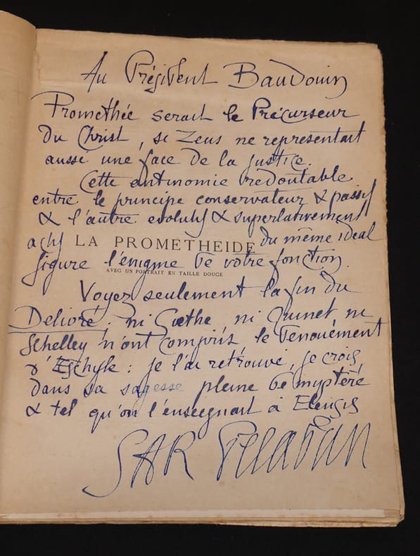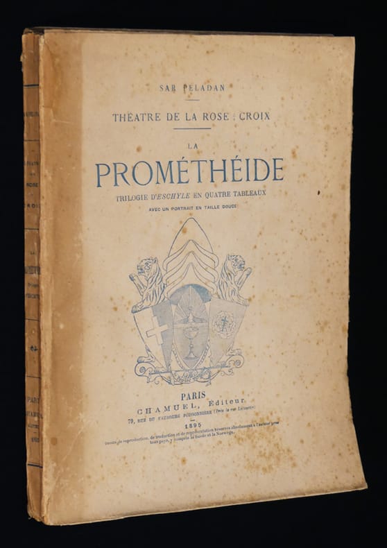 Trilogie d'Eschyle en 4 tableaux avec un portrait en taille douce. Chamuel. 1895. In-4 (182 x 235mm) broché, couverture imprimée en bleu, 163, (2) pages. Portrait du Sar Péladan en frontispice. Couverture un peu salie, rousseurs, papier uniformément bruni, dos abîmé.