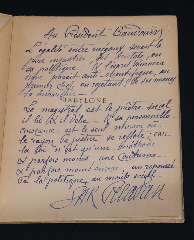 Edition originale, envoi autographe “Au chevalier Monti en R + C Cordialement. Péladan”. Babylone a connu cinq représentations publiques : en mars 1893 au Palais du Champs de Mars ; en 1894 au Théâtre de l’Ambigu (2) ; le 30 mai au Théâtre du Parc à Bruxelles et, le 5 juillet 1894 dans la salle des fêtes de Lady Caithness, duchesse de Pomar. Dos légèrement passé et couverture conservée un peu tachée, intérieur très propre, bon exemplaire dans une agréable reliure du temps.