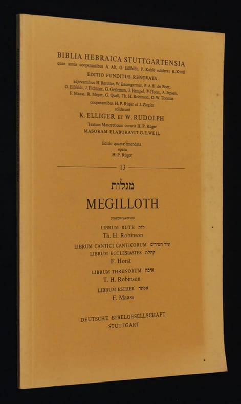 Biblia Hebraica, 13, Edidit Rud. Kittel. Ruth Praeparavit Th. H. Robinson. Canticum Cantocorum, Ecclesiastes Praep. Fr. Horst. Threni Praep. Th. H. Robinson. Esther Praep. Fr. Buhl. Editio 12a Emendata. Classification Dewey : 492.4-Hébreu