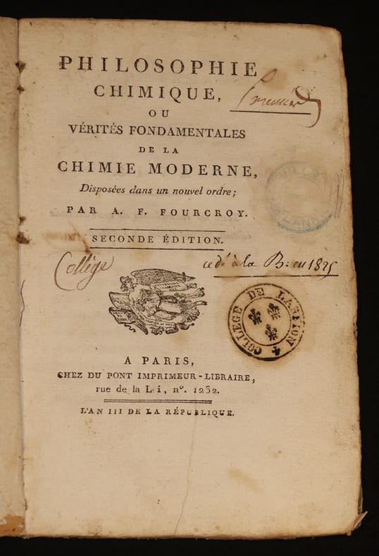 Paris, chez Du Pont imprimeur - Libraire, Paris, chez Du Pont imprimeur - LibraireAn III - 1795 ; In-8, Broché, couverture muette d'attente, entièrement non rogné. (Etat de parution) - 174 pp., 1 f. blanc - Seconde édition d'un livre important qui avait d'abord paru en 1792. Elle a été imprimée et vendue par le célèbre physiocrate Du Pont de Nemours. Après la dissolution de la Constituante, ce dernier dut chercher une carrière car la politique avait brisé sa situation administrative. Avec le concours financier de son intime Lavoisier il fonda une imprimerie en 1791, puis ouvrit aussi une librairie. On a injustement accusé Fourcroy d'avoir, par jalousie laissé condamné Lavoisier. L'impression de ce livre par l'un des plus chers amis de Lavoisier prouve à elle seule le ridicule de cette odieuse imputation. Les exemplaires de cette seconde édition portent au verso du titre la signature autographe de l'auteur. Duveen 225 - Ferguson I. 287 - Ferchl 161 - Partington III, 538 - Poggendorff I 783 - COle 470 - Neu 1482 - Blake 1482 - Blake 153 - Wellcome III 48 - Edelstein 903 - Sotheran 1384 : ""rare"". Bel exemplaire en état de parution. Il porte sur le titre un ex-dono manuscrit: ""Donné par le Comité d'Instruction publique. Daguin, élève de l'Ecole Normale, licencié dans la faculté des sciences, prof. émérite de Mathématiques au Lycée d'Orléans, et officier d'Académie."" Il s'agit en fait d'un don de l'auteur, car après le 9 thermidor, Fourcroy fut membre du comité de l'instruction publique."