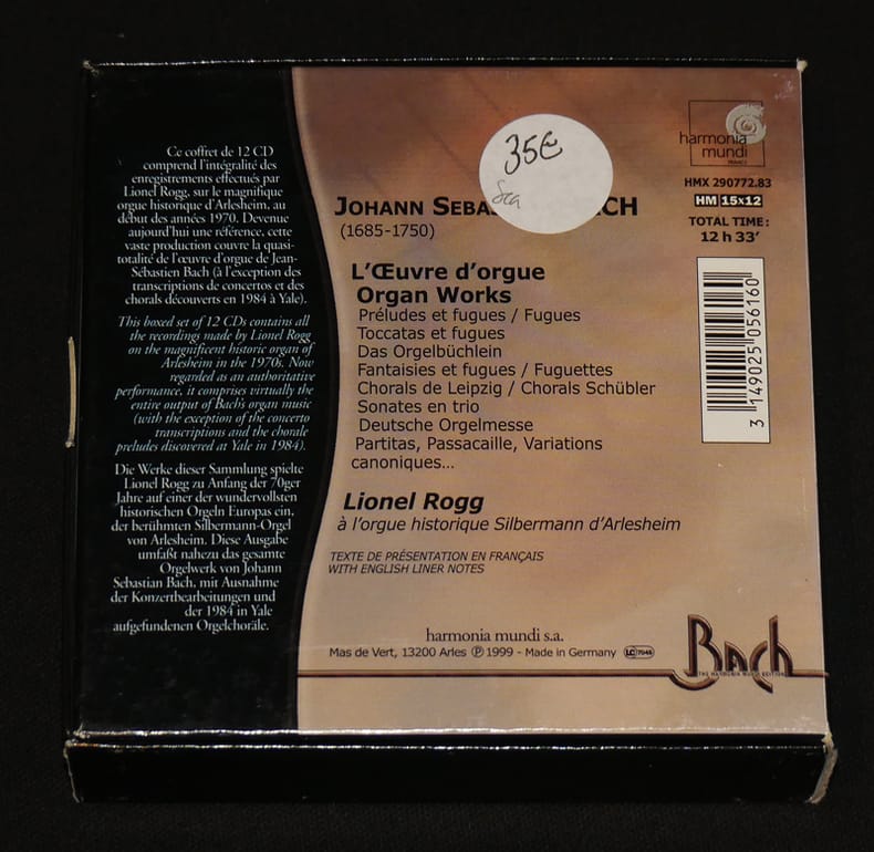 Harmonia Mundi CD 1999 "Coffret 12 CD ""L'Oeuvre d'orgue"" de Bach, contenant l'intégralité des enregistrements effectués par Lionel Rogg sur l'orgue historique d'Arlesheim au début des années 1970, durée totale : 12h33' ; frottements sur le boîtier, par ailleurs les pochettes contenant les CD ainsi que les CD eux-mêmes sont en très bon état. Livraison a domicile (La Poste) ou en Mondial Relay sur simple demande."