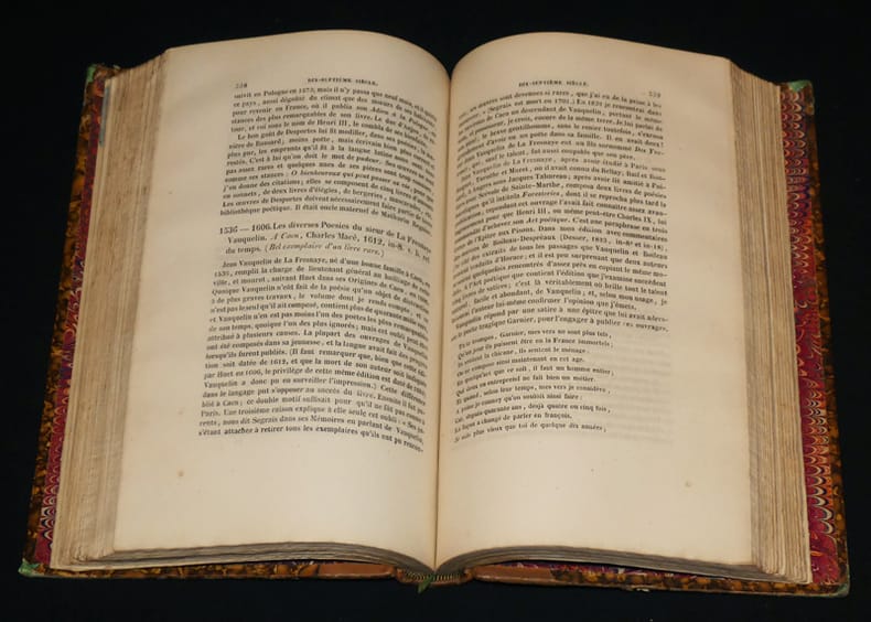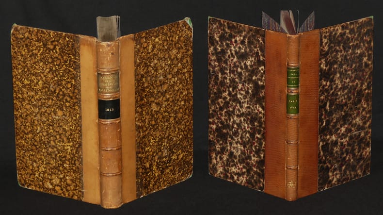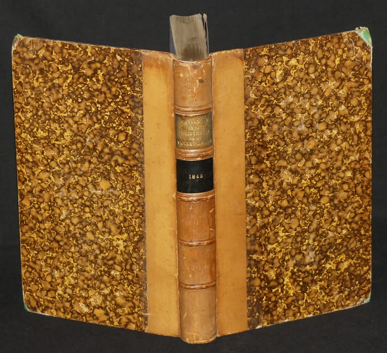 A Paris, chez L. Hachette, libraire de l'université royale de France, rue Pierre Sarazin, n° 12, J. Flot Relié 1843 "Deux volumes in-8 (14,7 x 22,6 cm et 15 x 22,7 cm), reliure demi-peau, dos à 5 nerfs, pièces de titre, cet ensemble comprend : ""Catalogue des livres composant la bibliothèque poétique de M. Viollet Le Duc, avec des notes bibliographiques, biographiques et littéraires sur chacun des ouvrages catalogués"" (L. Hachette, 1843, 623 pages) et ""Catalogue des livres composant la bibliothèque poétique de M. Viollet Le Duc, avec des notes bibliographiques, biographiques et littéraires sur chacun des ouvrages catalogués : Chansons, fabliaux, contes en vers et en prose, facéties, pièces comiques et burlesques, dissertations singulières, aventures galantes, amoureuses, prodigieuses"" (J. Flot, 1847, 252 pages) ; 1er volume : mors fendus fragilisés, coupes usées, cuir un peu craquelé au dos ; 2nd volume : mors frottés, rousseurs à l'intérieur ; assez bon état général. Livraison a domicile (La Poste) ou en Mondial Relay sur simple demande."
