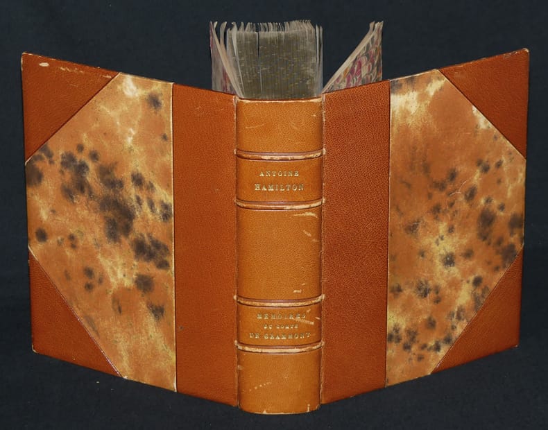 Édition originale de troisième tirage selon Tchemerzine.Délicieux ouvrage d'Hamilton (1646-1720), beau-frère du chevalier Grammont, dans lequel il campe un soldat libertin et peint le tableau précis de la cour de Charles II. Vignette au phénix sur la page de titre, titre en rouge et noir.Précieux exemplaire annoté par Ambroise-Firmin Didot (1790-1876) selon une double note autographe attribuée au bibliophile Antoine Rochebilière (en regard du titre et sur le feuillet de garde supérieur) : « il y en a plus. sous la même date de diff. impressions / (Hamilton) n°4 Edit. semblable au n°3. M. Didot (Ambroise Firmin) a corrigé au crayon cet exemplaire sur le mss. de Bercy jusqu'à la p. 179 de ce volume. Les corrections portent sur quelques mots ou groupes de mots avec renvoi en marge ; au verso du dernier feuillet de garde, erratum autographe à l'encre de Didot en lettres microscopiques : 47 au bas. Madame de Senantes au lieu de Monsieur de Senantes ms. p. 104.Une nouvelle édition de ces mémoires publiée par Didot frères parut en 1851. Les ouvrages provenant de la bibliothèque d'Antoine Rochebilière (1811-1881), la plupart annotés, furent vendus en 1882 et1884.Ex-libris manuscrit à l'encre du temps sur le titre Parmentier delamotte advocat, procureur du Roi en 1758. Quelques rousseurs et pâles mouillures cornières.Brunet, III, 29 ; Tchemerzine III, 656 ; Le Petit, 478 ; Catalogue Rochebilière, 2190.