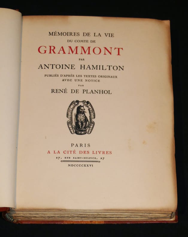 Diplomate intriguant et libertin, le compte Philibert de Grammont (1621-1707) confia à son beau-frère Hamilton l'impression de ses mémoires. On y trouve un tableau de la cour de Charles II. Impression soignée. - Un des 30 exemplaires sur Hollande, deuxième papier. Dos passé au fauve, excellent état par ailleurs.