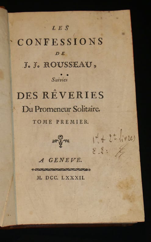 A GENÈVE, sans nom, 1782 0 Trois volumes (105 x 182mm), 160, 182 et 140 pp., broché, couvertures de papier dominoté. (deux couvertures légèrement tâchées, manque important de papier aux dos, deux titres très légèrement roussis). Édition en deux volumes de la première partie des Confessions, livres 1 à 6, parue la même année que l'originale. La publication des confessions fût entièrement posthume : 1782 pour la première partie et 1789 pour la seconde. Cette première partie a été rédigée de 1765 à 1767 et couvre les années 1712 - 1740 (années de formation, de la naissance à Genève à l'installation à Paris à 28 ans). Marque au titre et bandeau en tête de chaque volume. Le tome troisième contient les Rêveries d'un promeneur solitaire, présenté ici dans une édition publiée à Genève en 1782 (à la même date que l'édition originale). Exemplaire présenté ici dans sa couverture d'origine, tel que paru. Ex-libris manuscrit ancien sur les titres ( " G. F. LAGRAVERE "). RARE.