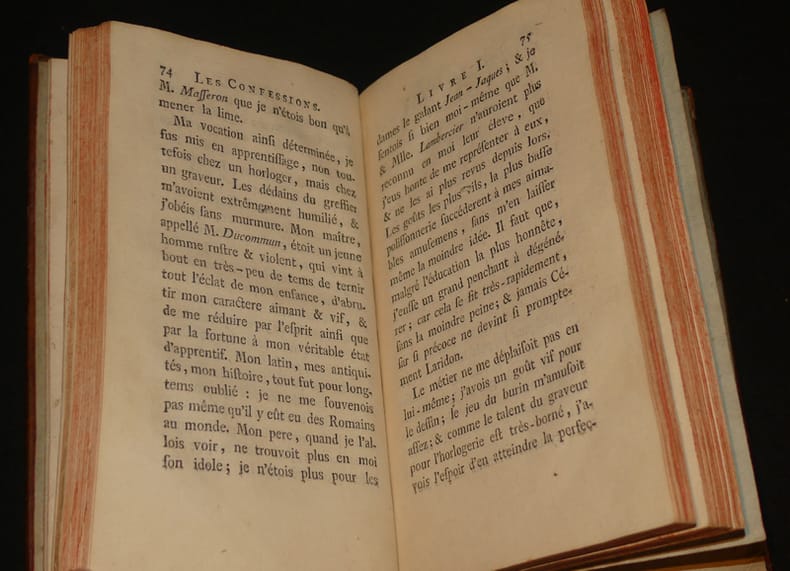 A Genève Relié 1782 "Trois volumes in-12 (12 x 19 cm), reliure d'époque plein veau, dos lisses orné de dorures et d'une pièce de titre et de tomaison, tranches rouges, 232, 471 et 280 pages, contrefaçon (motif à la rose) à la même date que l'originale, complet des 6 livres des Confessions en 3 tomes mais ne comprend pas le quatrième volume contenant les ""Rêveries du promeneur solitaire"" ; restaurations aux dos et coiffes, mors supérieur du tome 3 usé, notes à l'encre en début de chaque volume, petit travail de vers au tome 1 (ne gênant la lecture que de quelques mots), par ailleurs assez bon état général. Livraison a domicile (La Poste) ou en Mondial Relay sur simple demande."