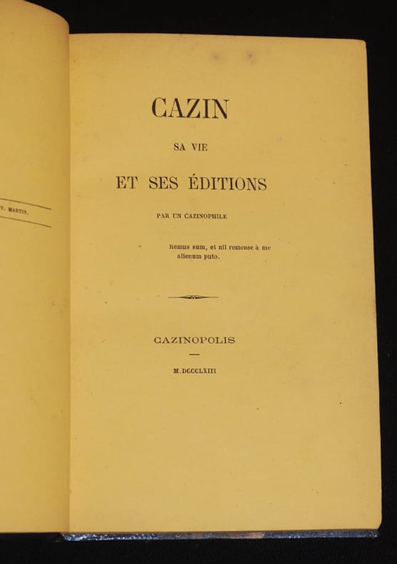 Cazinopolis [Reims], , 1863, in-18, 245 pages suivies d'un feuillet manuscrit titré "Table des ouvrages anonymes". Edition originale tirée à 320 exemplaires, celui-ci sur vergé. Bel exemplaire relié demi-chagrin bordeaux, dos à nerfs, tête dorée