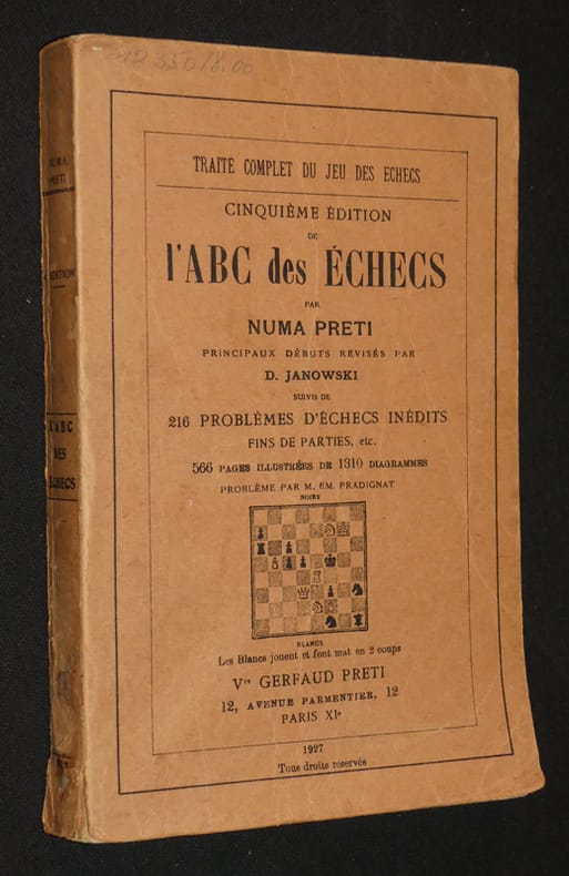 Gerfaud Preti Vve Broché 1927 In-8 broché, 566 pp., 1310 diagrammes, principaux débuts révisés par D. Janowski, suivis de 216 problèmes d'échecs inédits, fins de parties, etc. ; dos plié, couverture frottée, bon état. Livraison a domicile (La Poste) ou en Mondial Relay sur simple demande.