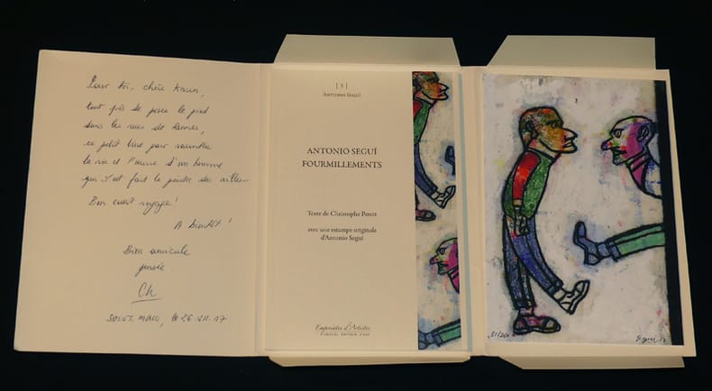 Cristel, éditeur d'art Empreintes d'Artistes Dos carré collé sous chemise 2017 "In-8 (14 x 21 cm), cinquième titre de la collection ""Empreintes d’Artistes"", portfolio contenant un livre de Christophe Penot et une estampe originale d’Antonio Seguí, chaque livre a été numéroté avant d’être signé par l’auteur, tandis que chaque estampe est numérotée et signée à la main par l’artiste. Cet exemplaire, qui porte le n°31 (sur les 250 imprimés sur vergé ivoire clair) comporte en outre un bel envoi de l'auteur ; très bon état général. Livraison a domicile (La Poste) ou en Mondial Relay sur simple demande."