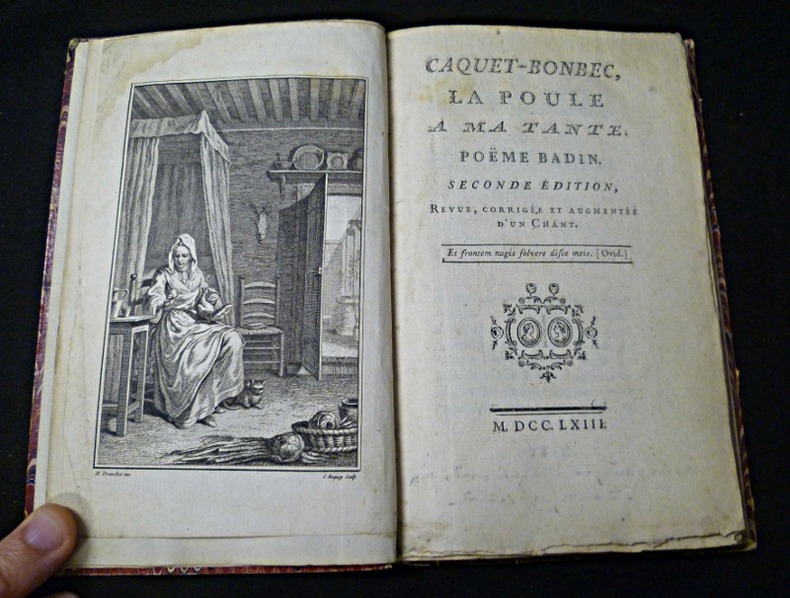 Deuxième édition rare. Conte grivois et antireligieux en vers, qui relate les aventures initiatiques d'une jolie poule dans le monde. L'auteur était capitaine des Chasses de la ille de Senlis. Des études spécialisées relèvent que cet ouvrage contient, curieusement, dans quatre de ses "chants", un décription exacte de pratiques d'alectryomancie, rite d'origine grecque utilisant les aptitudes divinatoires que les anciens prêtaient au coq. (Barbier, 'Ouvrages anonymes', I, 497. Gay, I, 475. Image disp.