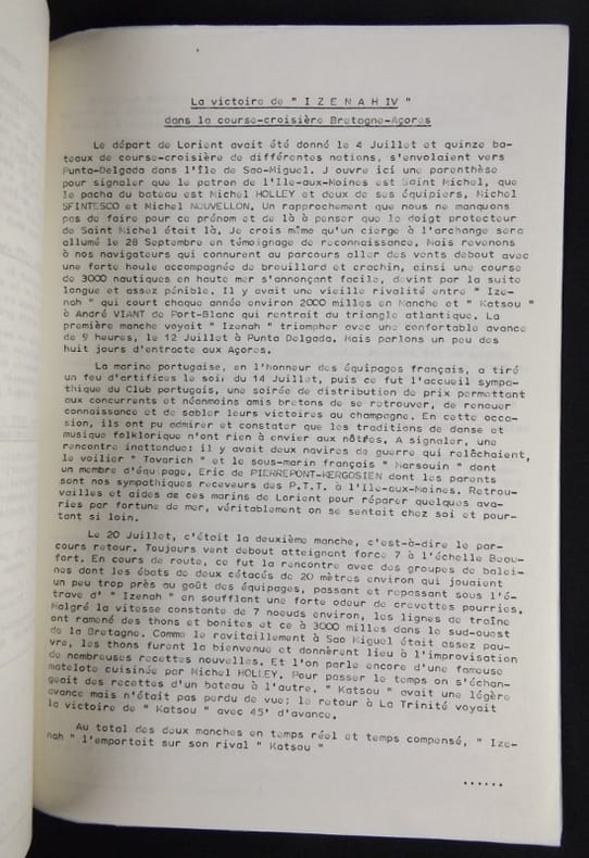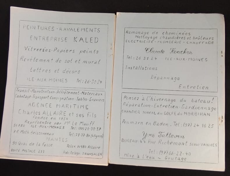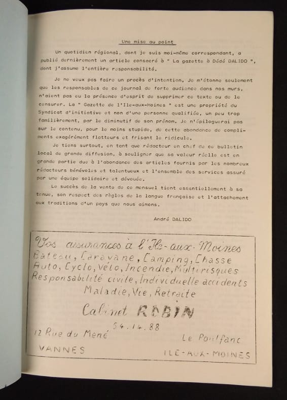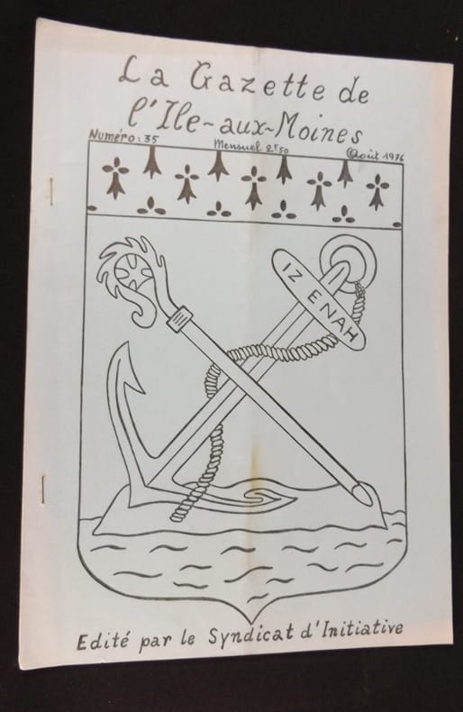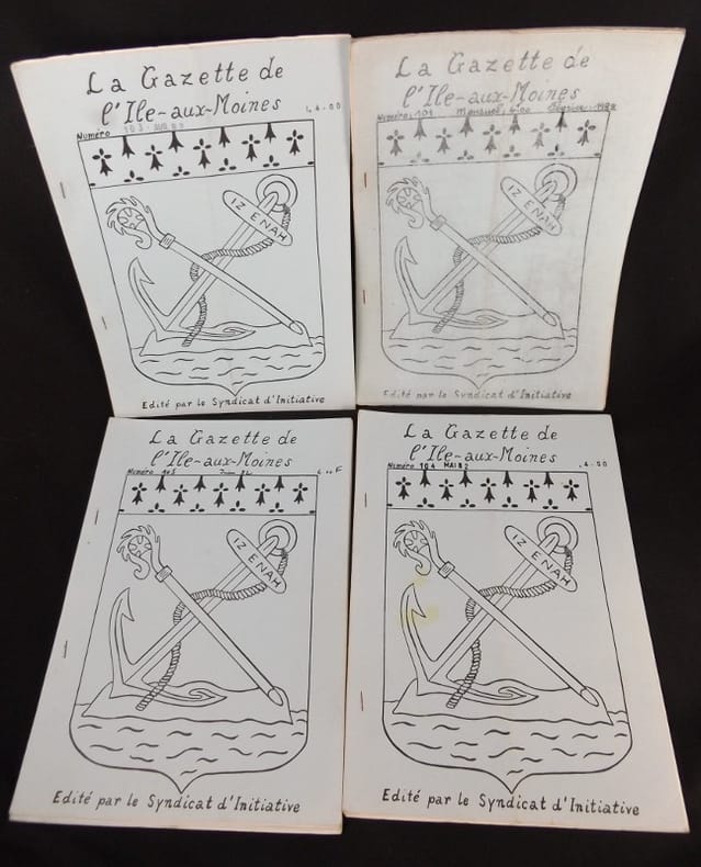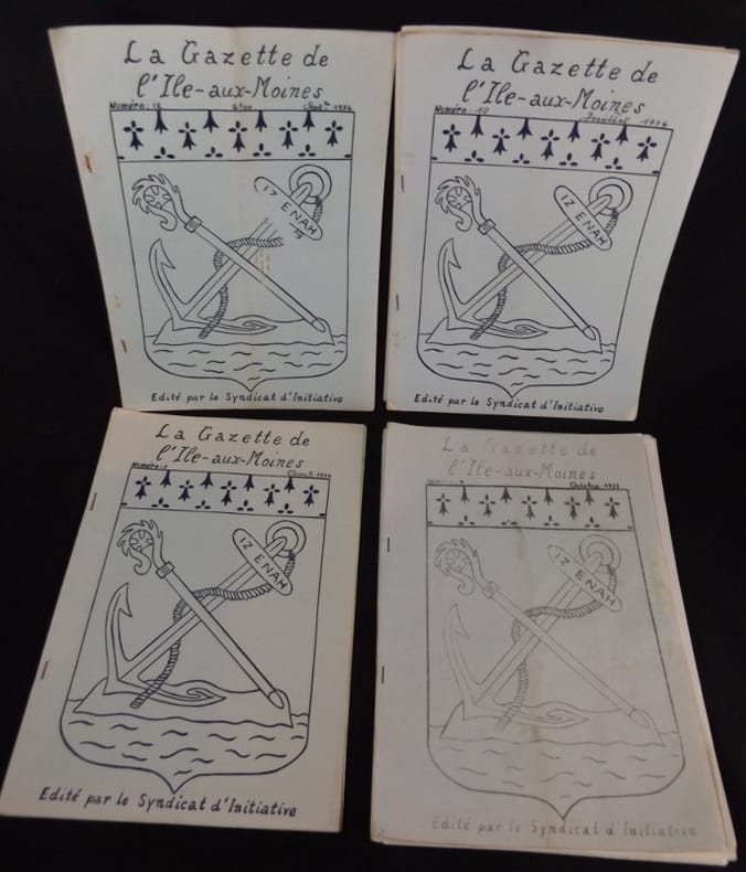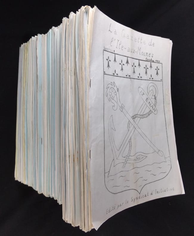 Syndicat d'Initiative de l'Île-aux-Moines Revue "Lot de 143 numéros in-4 (21 x 29,7 cm.), de ""La Gazette de l'Île -aux-Moines"" éditée par le Syndicat d'Initiative, journal local au dos agrafé, 1er plat illustré du blason de l'île, le lot comporte les numéros suivants: 1 / 7 / 10 / 12 à 45 / 49 à 155 / 157 à 159, d'Octobre 1973 à ""Dernier"" 1988, la revue traite de l'actualité et de l'histoire de l'île, avec notamment des bulletins de l'Association pour la Défense et la Protection de l’Île-aux-Moines, des annonces publicitaires des entreprises et commerces locaux, des articles divers de marine, pêche, etc., texte tapuscrit ; les premiers numéros sont un peu défraîchis, quelques numéros pliés, une agrafé manquante de temps à autre, par ailleurs bon état d'ensemble. Livraison a domicile (La Poste) ou en Mondial Relay sur simple demande."