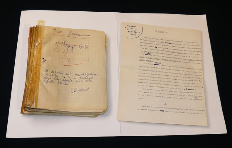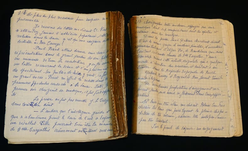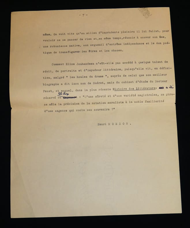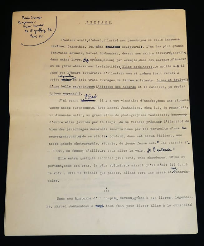 Manuscrit 1959 "Le Spleen empanaché. Manuscrit autographe daté du 23 juillet 1959 et signé par l'autrice Elise Jouhandeau, de son vrai nom Elisabeth Toulemont (1888-1971), danseuse excentrique de la Belle Epoque et épouse de Marcel Jouhandeau, qui la fit apparaître dans son oeuvre sous le nom d'Elise. Ce manuscrit, qui portait comme titre initial ""L'Esquif brisé"" et qui constitue le troisième et dernier volet de l'oeuvre autobiographique d'Elise Jouhandeau, ""Joies et douleurs d'une belle excentrique"", se compose de neuf petits cahiers grossièrement reliés au ruban adhésif formant 336 pages numérotées (on passe de la page 284 à la page 288 mais il s'agit d'une erreur, car il n'y a pas de manque au texte). On joint le tapuscrit corrigé de la préface d'Henri Mondor (7 pages in-4°). Provenance : secrétaire de Pierre Balmain (couturier et amant de Marcel Jouhandeau), à qui Pierre Balmain a donné ce manuscrit ; bon état. Livraison a domicile (La Poste) ou en Mondial Relay sur simple demande."