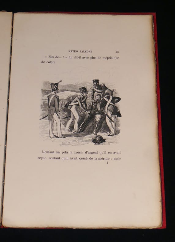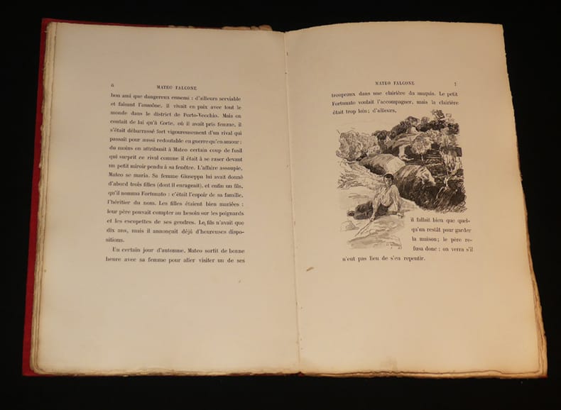 Illustration de Lucien Simon pour Mateo Falcone, nouvelle de Prosper Mérimée dans laquelle l'écrivain explore le sens de l'honneur si cher aux Corses. Le jeune fortunato a trahit l'honneur de sa famille et pour cela il doit être puni... Il le sera, par son père, un homme d'honneur et de parole, qui ne craint pas de faire couler le sang ! Dans le maquis Corse, près de Porto Vecchio, sous un soleil de plomb, Mateo Falcone tire un âne, duquel pend un faucon, dont il tire son nom...