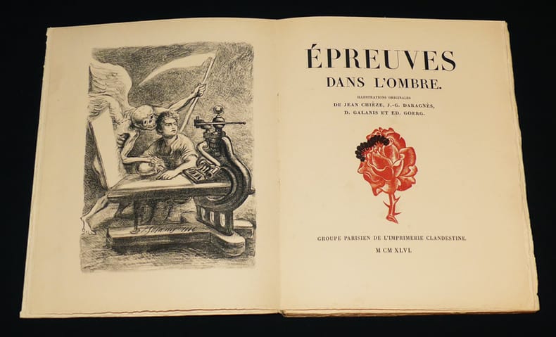 Paris, Groupe parisien de l'Imprimerie Clandestine, 1946 ; in-4. 106 pp.-1f. , 2 pp. Broché sous chemise et étui rigides de l'éditeur. Couverture rempliée illustrée d'un bois gravé en deux couleurs. 4 planches hors-texte en noir (dont le frontispice) par Jean Chièze, D. Galanis, Ed. Goerg et J.-G. Daragnès (qui à illustré la couverture et le titre). Etui jauni, si non parfait état.