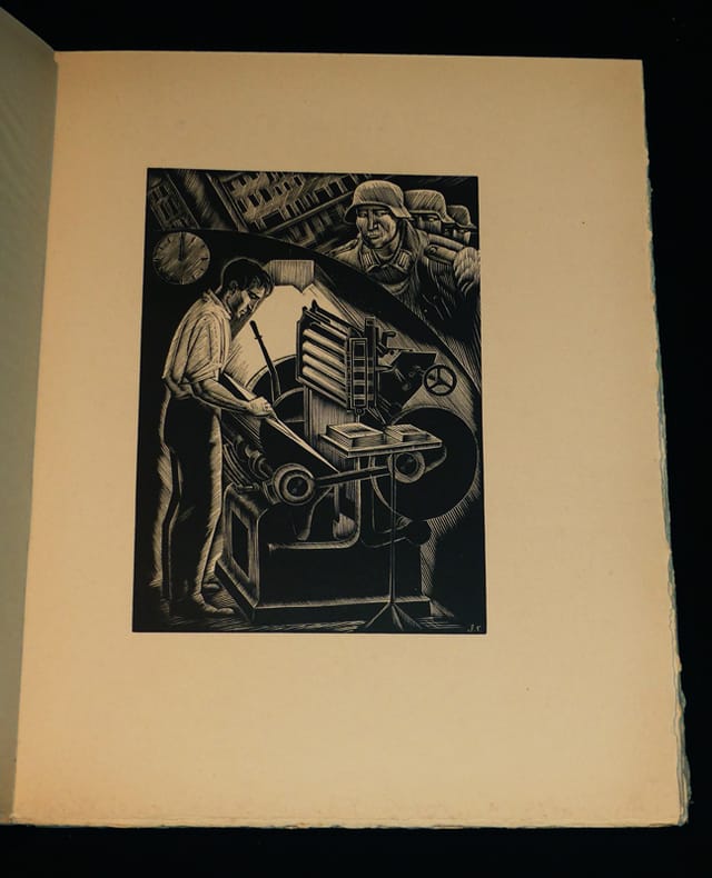Paris, Groupe parisien de l'Imprimerie Clandestine / Jacques Haumont imprimeur éditeur 1946. In-4 broché de 106 pages au format 28,5 x 22,5 cm. Couverture rempliée illustrée d'un bois gravé en deux couleurs par Jean-Gabriel Daragnès. Dos carré. Plats et intérieur frais. Exemplaire sous papier cristal d'origine. Ouvrage réalisé " A la mémoire des imprimeurs parisiens fusillés, décédés dans les camps allemands ou disparus... de leurs ouvriers et de tous les imprimeurs inconnus qui ont donné leur vie pour la liberté ". Textes inédits de François Mauriac, Georges Duhamel, Paul Eluard, Jacques Maritain, Jean Cassou, Claude Aveline, Jean Paulhan, Jean Bruller dit Vercors, Jean Schlumberger, Jean Ulmann et Michel Bernstein. A noter que ce dernier resta caché depuis 1942 dans un appartement parisien où il créa un atelier clandestin de faux papiers, cachets, timbres... Il rédigea également à l'usage des résistants un Manuel du faussaire peu avant la libération, à la demande de Défense de la France. Textes accompagnés de 4 planches hors-texte en noir (dont le frontispice) réalisé par Jean Chièze, Démétrios Galanis, Edouard Goerg et Jean-Gabriel Daragnès. Un des 400 exemplaires numérotés sur pur chiffon filigrané Bélier Lana ( n° 35 ), après 100 hors commerce. Rare édition originale en superbe état général.