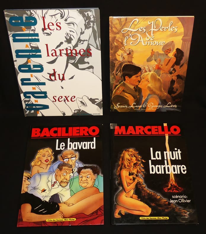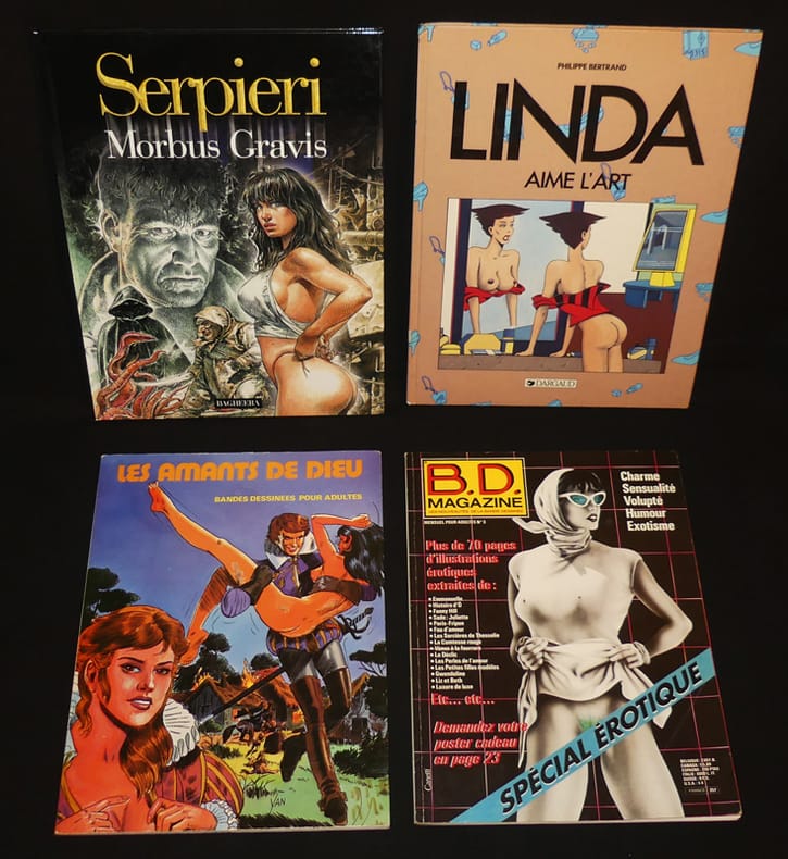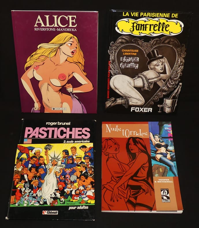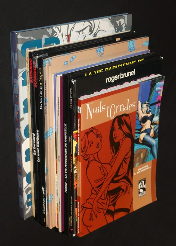 Humanoïdes associés, Albin Michel, Dargaud, Glénat, L'Echo des savanes, Editions du Balcon, Bagheera, Neptune, International-presse-magazine album cartonné Bandes dessinées au format in-4, cartonnées sauf pour trois d'entre d'elles qui sont souples, ce lot contient les titres suivants : Nuits torrides - B.Dn magazine special érotique, numéro 3 - Les amants de Dieu - Pastiches 2 école américaine - La vie parisienne de Fanfrelle - Alice - Linda aime l'art - Morbus Gravis - La nuit barbare - Le bavard - Les perles de l'amour - Les larmes du sexe ; menus incidents, lot en bon état. Livraison a domicile (La Poste) ou en Mondial Relay sur simple demande.