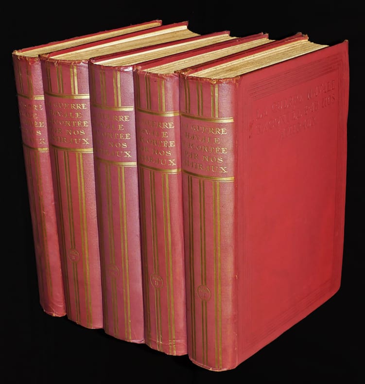 sd, Librairie Schwarz, in-folio cartonné, couverture percaline bordeaux, titrage doré sur dos rond, Tome 1 : Amiral Ratyé - Les prodromes de la guerre, l'aventure du «Goeben » et du «Breslau » (du 2 aout au 10 aout 1914), les opérations maritimes dans l'océan, la mer du noed et les océans lointains - Tome 2 : Amiral Ratyé - La stratégie navale britannique, le plan de guerre britannique - Amiral Salaun - Les opérations en Méditérranée sous le commandement du vice-amiral boué de Lapeyrère (12 aout 1914-14 octobre 1915) - Amiral Dumesnil - L'expédition des Dardanelles (aout 1914-janvier 1916) - [...] | Etat : Très bon état général, couvertures un peu défraîchies, coins et coiffes frottés, cuir éraflé (Ref.: G10144)