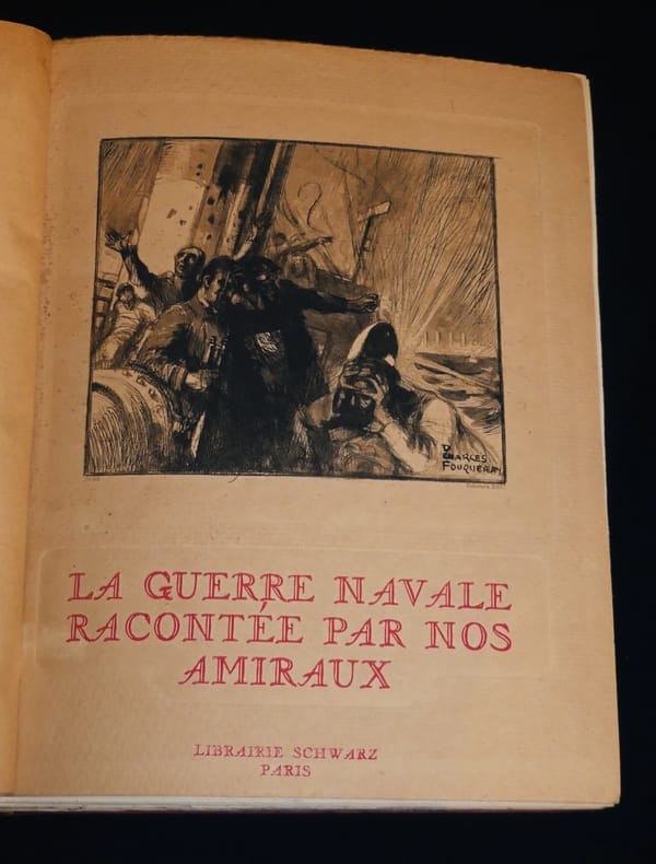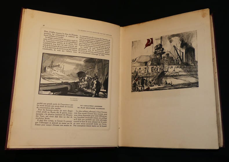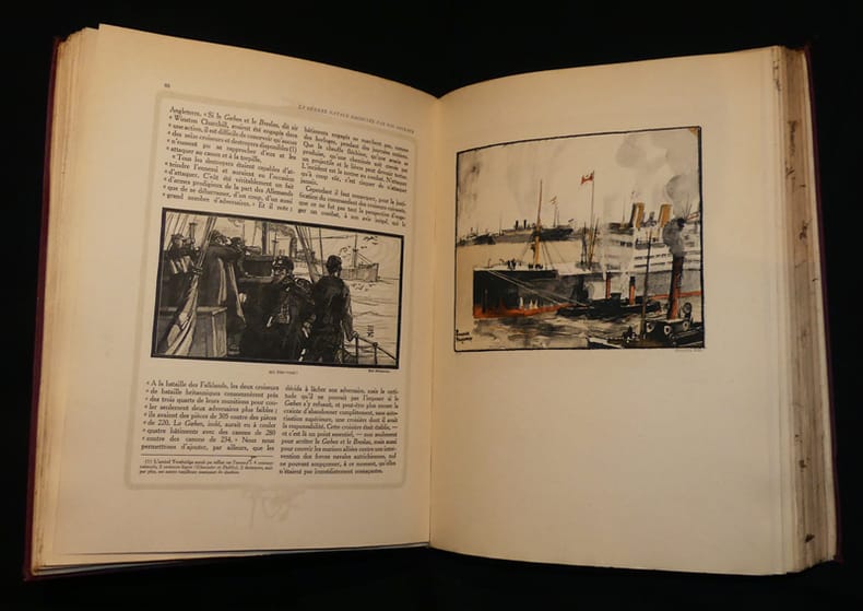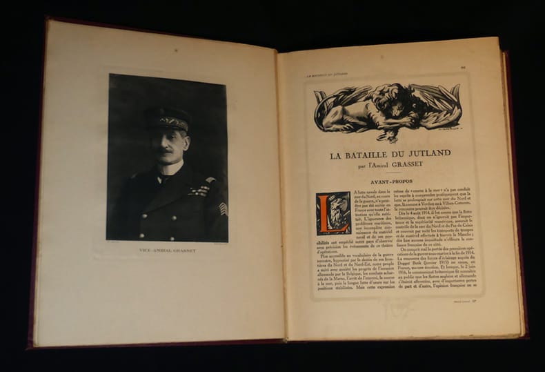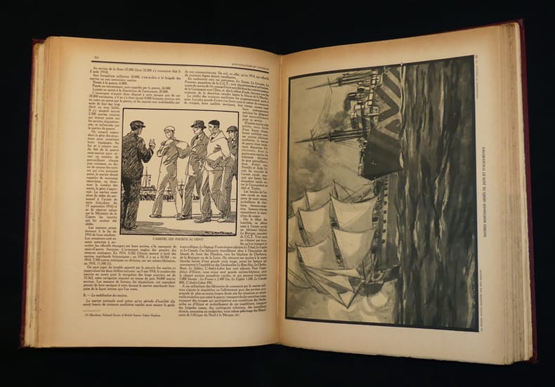 3 fort et grand vol. in-4 reliure éditeur demi-chagrin vert, Librairie Schwarz, Paris, s.d. (circa 1920), 416 pp. (pagination suivie) avec très nombreuses planches en hors texte (souvent par Charles Fouqueray), texte et légende des planches et table générale des matières en sus. Rappel des Titres : Tome I : Les prodromes de la guerre. L'aventure du "Goeben" et du "Breslau" (du 2 août au 10 août 1914). Les opérations maritimes dans l'Océan, la Mer du Nord et les océans lointains ; Tome II : La Stratégie navale britannique. Le plan de guerre britannique (Amiral Ratyé) - Les Opérations en Méditerranée sous le Commandement du Vice-Amiral Boué de Lapeyrère 12 août 1914 - 14 octobre 1915 (Amiral Salaun) - L'expédition des Dardanelles (août 1914 - Janvier 1916) (Amiral Dumesnil) ; Tome III : La guerre sur les théatres d'opérations extérieurs (Amiral Docteur) - Intervention de l'Italie (Amiral Lacaze) - La Guerre Navale dans l'Adriatique (Amiral Frochot) - La Bataille du Jutland (Amiral Grasset) - Les Opérations en Méditerranée sous le commandement de l'Amiral Dartige du Fournet (octobre 1915 - décembre 1916) (Amiral Fatou) - Les Opérations en Méditerranée sous le commandement de l'Amiral Gauchet (Décembre 1916 - Novembre 1918) (Amiral Varney) - Les canonniers marins sur le front des armées (Amiral Jehenne) - Les fusiliers marins au Front des Flandres (Amiral Ronarc'h)