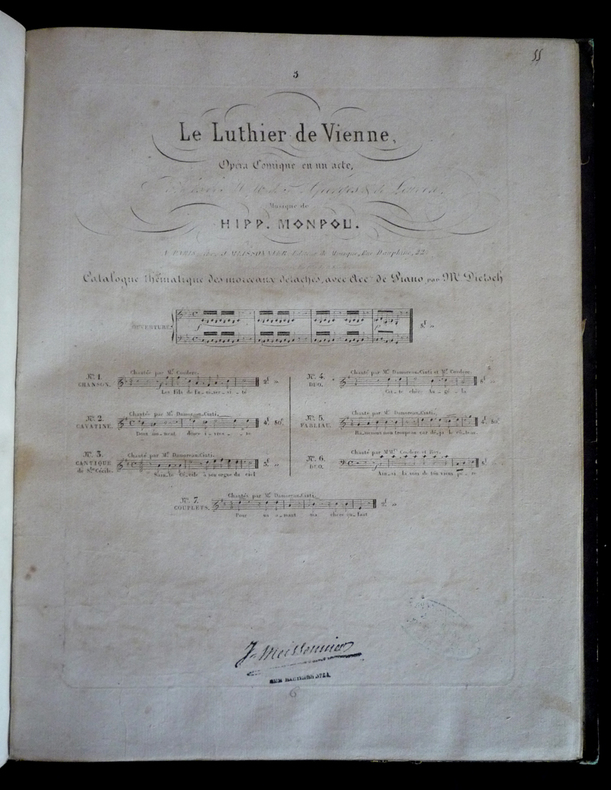 Meissonnier Relié In-4 (27 x 34,3 cm), reliure demi peau, dos lisse orné de dorures, tranches dorées, partitions pour les extraits des opéras suivants : Le Juif errant ; Le Barbier de Séville ; Gulistan ; Le Bijou perdu ; Le Voile écarté ; La Rose de Péronne ; Le Luthier de Vienne ; La Part du diable ; Le Brasseur de Preston ; Le Calife de Bagdad ; La Perruche ; Le Domino noir ; Le Roi d'Yvetot ; Guillaume Tell ; Charles VI ; Les Monténégrins ; mors et coiffes frottés, marques d'usage sur les plats et coins, quelques rousseurs, état moyen. Livraison a domicile (La Poste) ou en Mondial Relay sur simple demande.