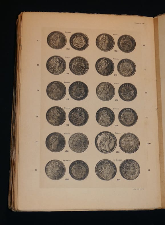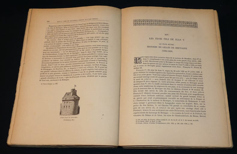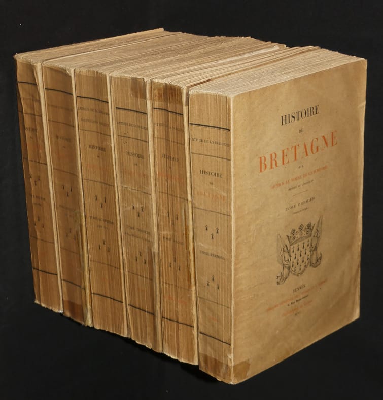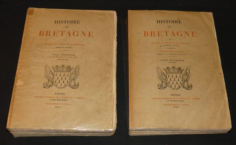 Plihon et Hervé, Librairie générale de J. Plihon et L. Hommay Broché 1905 6 volumes in-4 (28x19.5 cm), brochés, volumes édités de 1898 à 1914, quelques petites illustrations en noir et blanc. Premier volume (1905, deuxième tirage) : 4 cartes in-fine. Deuxième volume (1898) : 2 cartes in-fine. Troisième volume (1906 deuxième tirage) : manque la grande carte de la Bretagne féodale, la carte de la bataille d'Auray est bien présente, la copie de l'ordonnance de Jean Leroux et texte de l'assise de 1240 sont bien présents. 4° volume (1906) : carte de Saint-Aubin du Cormier. 5° volume (1913) une grande carte dans une chemise, complet de tous les hors texte y compris les 3 planches de papiers timbrés. 6° volume (1914) complet des planches hors-texte annoncées dans l'ouvrage dont les 6 planches de monnaies. En outre l'ouvrage comporte des planches hors-texte : portraits des grands de ce monde... Des cartes et des petites gravures dans le texte ; traces de scotch sur les gardes dues à une couverture plastique scotchée, traces de scotch à certaines coiffes et sur les mors, sinon bon état général. Livraison a domicile (La Poste) ou en Mondial Relay sur simple demande.