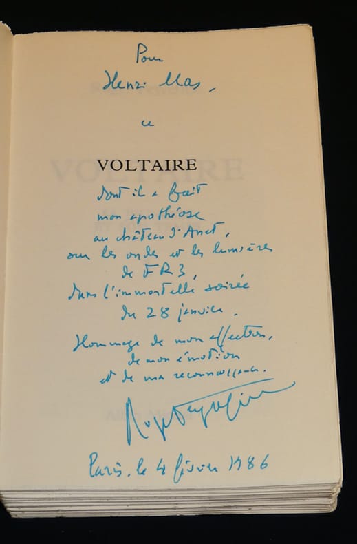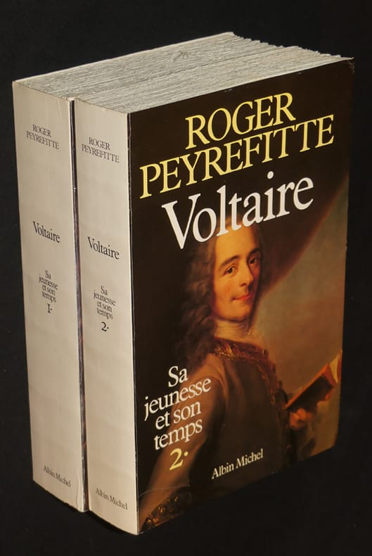 Albin Michel Broché 1985 "Rare exemplaire du tirage de tête sur Hollande, avec de beaux envois de Roger Peyrefitte à Henri Mas, dont il a été tiré 80 exemplaires 70 numérotés en chiffre arabe et dix numérotés en chiffre romain hors commerce. Notre exemplaire est un des très rares dix exemplaires hors commerce sur vergé blanc chiffon filigrané des papeteries Royales Van Gelder Zonen de Hollande. Ici l'exemplaire numéro III. L'ouvrage se présente en deux volumes de 16.2 * 25 cm de 482 et 389 pages. Ils sont non coupés. Il y a un envoi dans chaque volume ecrit à l'encre bleu ciel chère à Roger Peyrefitte : Volume I : ""Pour Henri Mas ce Voltaire dont il a fait mon apothéose au château d'Anet, sur les ondes et les lumières de FR3 dans l'immortelle soirée du 28 janvier. Hommage de mon affection, de mon émotion et de ma reconnaissance. Roger Peyrefitte, Paris, le 4 février 1986. Volume II : ""Pour mon jeune frère de coeur Henri Mas, ce second tome de notre Voltaire... Que dirais-je d'autre, mon cher Henri après ma première dédicace ? Mon Pâris et ma devise vous le diront mieux que moi. Je vous embrasse. Roger. Paris - sous Pâris - le 5 février 1986"" sur cette page Roger Peyrefitte a également collé un de ses ex-libris représentant le Pâris (fils cadet du roi Priam et d'Hécube, célèbre pour l'épisode du jugement portant son nom). Roger Pyerefitte détenait une statue de Pâris reproduite sur cet ex-libris. La devis de l'ex-libris est la suivante : ""l'amour est ma justice"". Henri Mas était journaliste à FR3. Des amitiés particulières ? ; de petits défauts aux couvertures, sinon très bel exemplaire proche du neuf. Livraison a domicile (La Poste) ou en Mondial Relay sur simple demande."