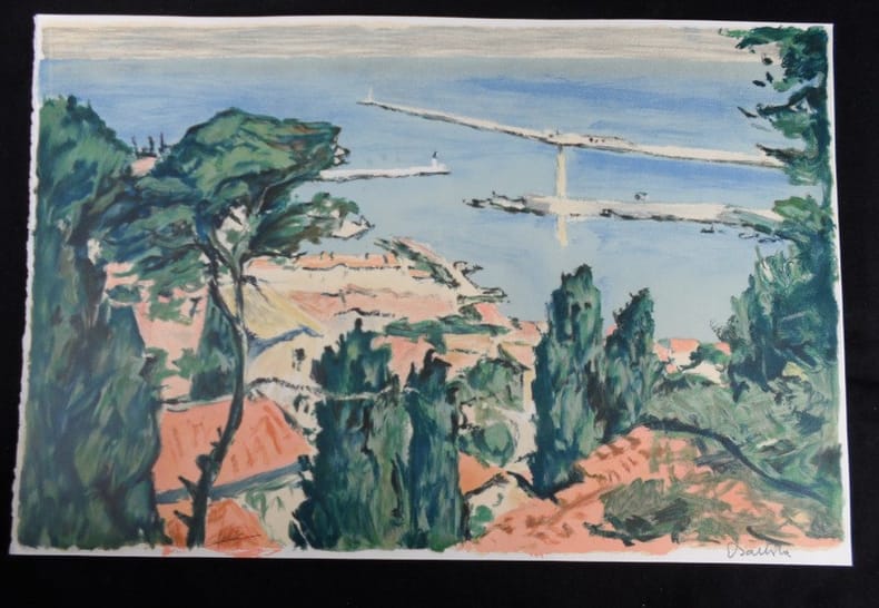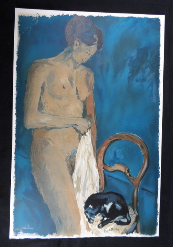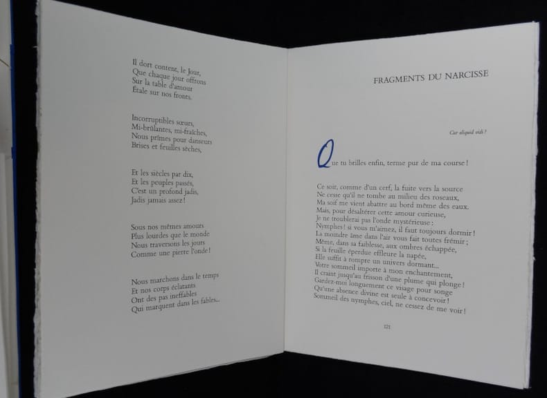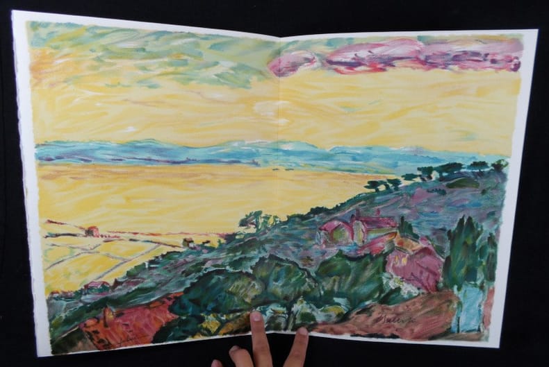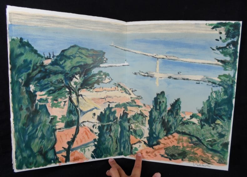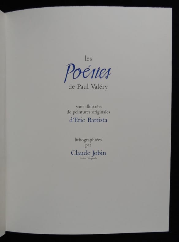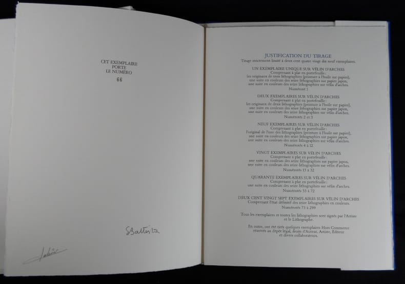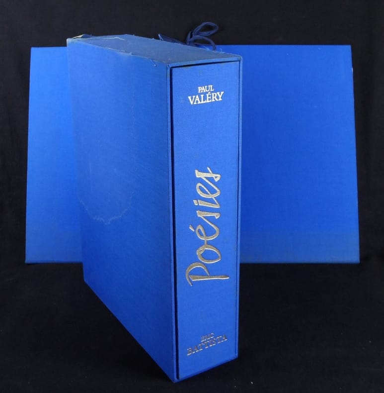 Editions du Grésivaudan Cahiers sous chemise et emboîtage 1980 In-folio (28 x 37 cm.), cahiers sous chemise papier rempliée, sous chemise toilée en bleu sous emboîtage assorti, titre, auteur et illustrateur dorés au dos de la chemise toilée, avec suite à port sous porte-folio toilé bleu assorti avec lien, 243 pages, tirage limité à 299 exemplaires, un des 40 exemplaires tirés sur Vélin d'Arches (n°66) comprenant à plat en portefeuille: une suite en couleurs des seize lithographies sur Vélin d'Arches (sous serpente), signé par l'artiste et le lithographe, 16 très belles lithographies en couleurs d'Éric Battista et lithographiées par Claude Jobin, cahiers non ébarbés ; l'emboîtage: importante mouillure touchant 3 côtés / un coin se décollant / quelques fils apparents, dos de la chemise toilée légèrement piqué, idem pour les bords du porte-feuille, en revanche cahiers et lithographies intacts, mis à part l'emboîtage, très bon état général. Livraison a domicile (La Poste) ou en Mondial Relay sur simple demande.