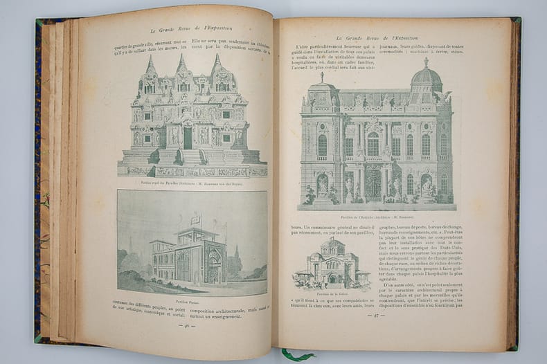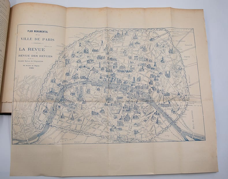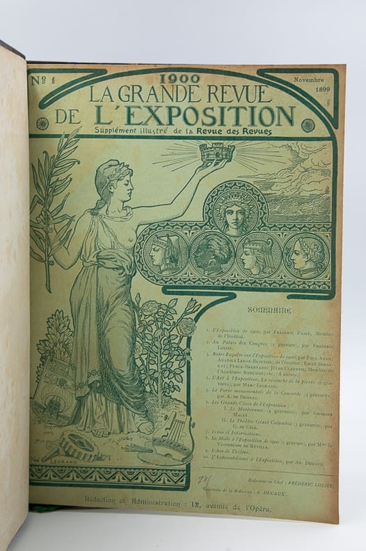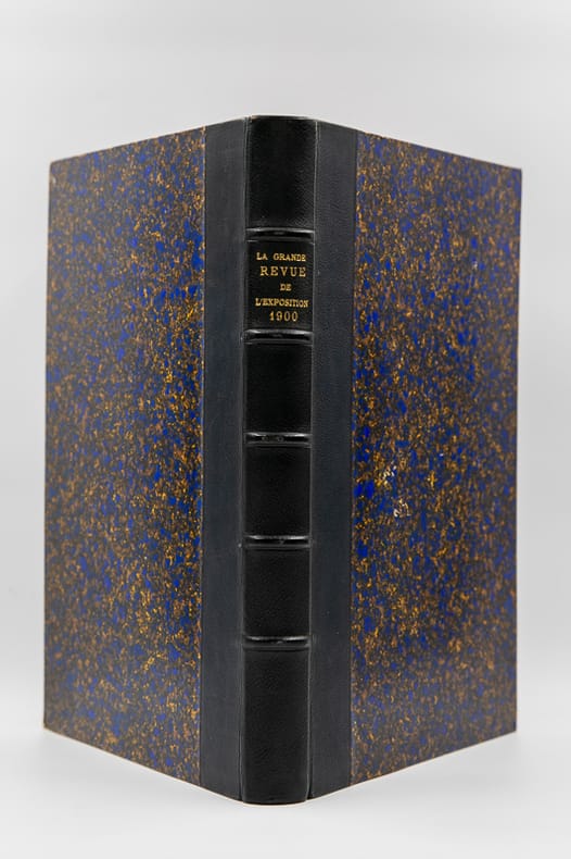 Typ. A. Davy Relié 1899 "REUNION COMPLETE DES 15 NUMEROS DE LA REVUE La Grande revue de l'exposition : supplément illustré de La Revue des revues. du n°1 (novembre 1899) au n° 16 (mai 1900). 16 numéros mensuels en 15 brochures reliées en un grand volume in-4 (30x23 cm), demi-chagrin bleu foncé, dos à nerfs, titre doré, plats de papier marbré, 260 pages en pagination continue, toutes les couvertures illustrées ont été conservées, nombreuses illustrations en noir dans le texte et une grande carte dépliante de la ville de Paris au recto et et de l'Exposition universelle au verso hors texte du numéro 9. Rédaction et administration : 12 avenue de l'Opéra, Paris, Typ. A. Davy, rue Madame, 52, 1899-1900. Rédacteur en chef : Frédéric Loliée; ""Revue esthétique et impartiale de tous les trésors que Paris et ses nombreux exposants vont offrir au monde ébloui qui viendra admirer notre grande fête du Travail et de la Paix"" (2e de couverture) ; quelques traces rousseurs sur les couvertures et en marge sinon très bon exemplaire, très frais. Livraison a domicile (La Poste) ou en Mondial Relay sur simple demande."
