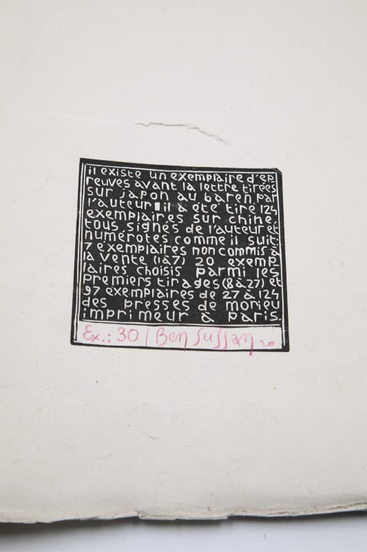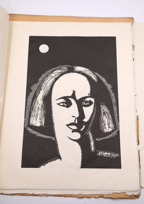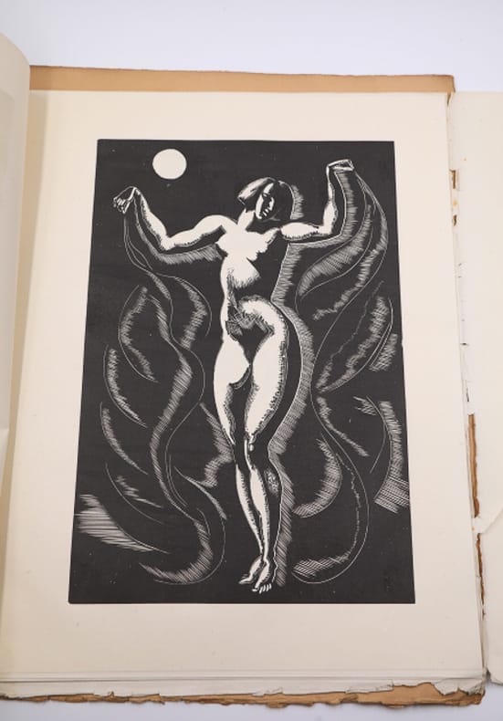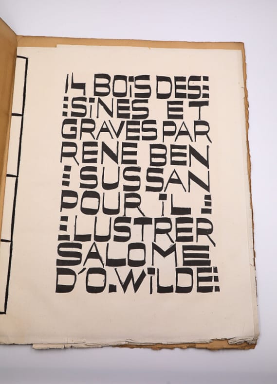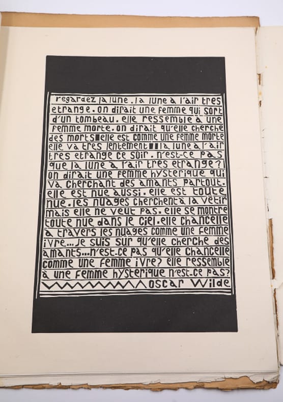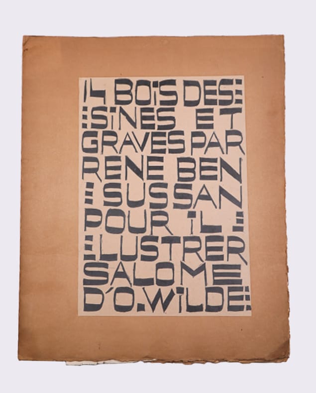 Morieu, imprimeur Planches sous chemise ILLUSTRATIONS DE LA SALOME D'O. WILDE. Grand in-4 (41x33 cm), en feuillets sous chemise cartonnée illustrée, (1) f. de titre, (1) f. de texte, 14 bois gravés à pleine page et (1) f. dépliant. Tirage limité à 124 exemplaires sur Chine, tous signés par l'artiste, celui-ci n° 30. Morieu, imprimeur à Paris, sans date (vers 1930). Puissante illustration de la pièce d'Oscar Wilde ; déchirure (voir photo) au dernier feuillet. Livraison a domicile (La Poste) ou en Mondial Relay sur simple demande.